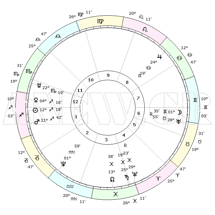 | | ΘΕΣΕΙΣ ΠΛΑΝΗΤΩΝ ΑΣΤΡΟΛΟΓΙΚΟΥ ΧΑΡΤΗ ΤΗΣ ΣΤΙΓΜΗΣ ΑΥΤΗΣ | | | | Πλανήτης | Ζώδιο | Μοίρες | Δεκαήμ. | Σε οίκο | Απόκλιση | | Ακμές των οίκων | | Ηλιος | Τοξότης | 12°16' | Δεύτερο | 1 | 22 S 16 | | 1ος | 00°48' | Τοξότης | | Σελήνη | Δίδυμοι | 01°06' | Πρώτο | 7 | 25 N 09 | | 2ος | 02°03' | Αιγόκερως | | Ερμής | Σκορπιός | 22°17' | Τρίτο | 12 | 15 S 51 | | 3ος | 07°53' | Υδροχόος | | Αφροδίτη | Τοξότης | 04°13' | Πρώτο | 1 | 20 S 24 | | 4ος | 13°57' | Ιχθείς | | Αρης | Τοξότης | 21°41' | Τρίτο | 1 | 23 S 52 | | 5ος | 14°53' | Κριός | | Δίας | Καρκίνος | 24°19'R | Τρίτο | 8 | 21 N 25 | | 6ος | 09°49' | Ταύρος | | Κρόνος | Ιχθείς | 25°19' | Τρίτο | 4 | 04 S 02 | | 7ος | 00°48' | Δίδυμοι | | Ουρανός | Ταύρος | 28°55'R | Τρίτο | 6 | 19 N 43 | | 8ος | 02°03' | Καρκίνος | | Ποσειδώνας | Ιχθείς | 29°23'R | Τρίτο | 4 | 01 S 29 | | 9ος | 07°53' | Λέων | | Πλούτωνας | Υδροχόος | 01°59' | Πρώτο | 2 | 23 S 23 | | 10ος | 13°57' | Παρθένος | | Β. Δεσμός | Ιχθείς | 13°39' | Δεύτερο | 3 | 06 S 26 | | 11ος | 14°53' | Ζυγός | | Ωροσκόπος | Τοξότης | 00°48' | Πρώτο | | | 12ος | 09°49' | Σκορπιός | | Μεσουράνημα | Παρθένος | 13°57' | Δεύτερο | | | |