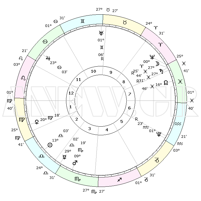 | ΘΕΣΕΙΣ ΠΛΑΝΗΤΩΝ ΑΣΤΡΟΛΟΓΙΚΟΥ ΧΑΡΤΗ ΤΗΣ ΣΤΙΓΜΗΣ ΑΥΤΗΣ | | Πλανήτης | Ζώδιο | Μοίρες | Δεκαήμ. | Σε οίκο | Απόκλιση | | Ακμές των οίκων | Ηλιος | Ζυγός | 12°58' | Δεύτερο | 3 | 05 S 07 | | 1ος | 08°31' | Λέων | Σελήνη | Ιχθείς | 26°34' | Τρίτο | 9 | 00 S 40 | | 2ος | 00°12' | Παρθένος | Ερμής | Ζυγός | 28°55' | Τρίτο | 4 | 11 S 44 | | 3ος | 26°24' | Παρθένος | Αφροδίτη | Παρθένος | 20°12' | Τρίτο | 2 | 05 N 10 | | 4ος | 28°21' | Ζυγός | Αρης | Σκορπιός | 09°16' | Πρώτο | 4 | 14 S 42 | | 5ος | 04°03' | Τοξότης | Δίας | Καρκίνος | 23°03' | Τρίτο | 12 | 21 N 30 | | 6ος | 08°25' | Αιγόκερως | Κρόνος | Ιχθείς | 27°31'R | Τρίτο | 9 | 03 S 17 | | 7ος | 08°31' | Υδροχόος | Ουρανός | Δίδυμοι | 01°06'R | Πρώτο | 10 | 20 N 10 | | 8ος | 00°12' | Ιχθείς | Ποσειδώνας | Κριός | 00°25'R | Πρώτο | 9 | 01 S 06 | | 9ος | 26°24' | Ιχθείς | Πλούτωνας | Υδροχόος | 01°23'R | Πρώτο | 6 | 23 S 32 | | 10ος | 28°21' | Κριός | Β. Δεσμός | Ιχθείς | 16°47' | Δεύτερο | 8 | 05 S 13 | | 11ος | 04°03' | Δίδυμοι | Ωροσκόπος | Λέων | 08°31' | Πρώτο | | | 12ος | 08°25' | Καρκίνος | Μεσουράνημα | Κριός | 28°21' | Τρίτο | | | |