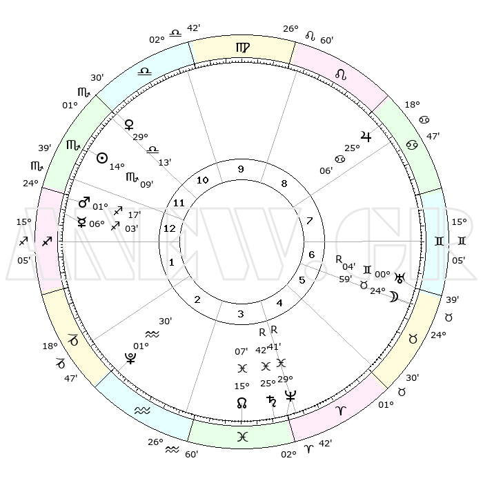 | | ΘΕΣΕΙΣ ΠΛΑΝΗΤΩΝ ΑΣΤΡΟΛΟΓΙΚΟΥ ΧΑΡΤΗ ΤΗΣ ΣΤΙΓΜΗΣ ΑΥΤΗΣ | | | | Πλανήτης | Ζώδιο | Μοίρες | Δεκαήμ. | Σε οίκο | Απόκλιση | | Ακμές των οίκων | | Ηλιος | Σκορπιός | 13°13' | Δεύτερο | 10 | 15 S 48 | | 1ος | 12°04' | Αιγόκερως | | Σελήνη | Ταύρος | 10°57' | Δεύτερο | 4 | 19 N 01 | | 2ος | 22°19' | Υδροχόος | | Ερμής | Τοξότης | 05°36' | Πρώτο | 11 | 23 S 59 | | 3ος | 02°33' | Κριός | | Αφροδίτη | Ζυγός | 28°05' | Τρίτο | 9 | 09 S 28 | | 4ος | 04°21' | Ταύρος | | Αρης | Τοξότης | 00°37' | Πρώτο | 11 | 20 S 42 | | 5ος | 28°55' | Ταύρος | | Δίας | Καρκίνος | 25°05' | Τρίτο | 7 | 21 N 12 | | 6ος | 20°11' | Δίδυμοι | | Κρόνος | Ιχθείς | 25°44'R | Τρίτο | 2 | 03 S 57 | | 7ος | 12°05' | Καρκίνος | | Ουρανός | Δίδυμοι | 00°06'R | Πρώτο | 5 | 19 N 58 | | 8ος | 22°19' | Λέων | | Ποσειδώνας | Ιχθείς | 29°42'R | Τρίτο | 2 | 01 S 22 | | 9ος | 02°33' | Ζυγός | | Πλούτωνας | Υδροχόος | 01°29' | Πρώτο | 1 | 23 S 30 | | 10ος | 04°21' | Σκορπιός | | Β. Δεσμός | Ιχθείς | 15°10' | Δεύτερο | 2 | 05 S 51 | | 11ος | 28°55' | Σκορπιός | | Ωροσκόπος | Αιγόκερως | 12°04' | Δεύτερο | | | 12ος | 20°11' | Τοξότης | | Μεσουράνημα | Σκορπιός | 04°21' | Πρώτο | | | |
