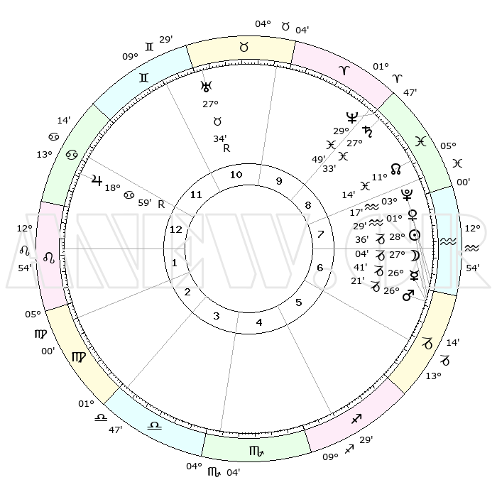 | | ΘΕΣΕΙΣ ΠΛΑΝΗΤΩΝ ΑΣΤΡΟΛΟΓΙΚΟΥ ΧΑΡΤΗ ΤΗΣ ΣΤΙΓΜΗΣ ΑΥΤΗΣ | | | | Πλανήτης | Ζώδιο | Μοίρες | Δεκαήμ. | Σε οίκο | Απόκλιση | | Ακμές των οίκων | | Ηλιος | Αιγόκερως | 28°32' | Τρίτο | 7 | 20 S 27 | | 1ος | 25°05' | Καρκίνος | | Σελήνη | Αιγόκερως | 26°18' | Τρίτο | 7 | 24 S 21 | | 2ος | 15°50' | Λέων | | Ερμής | Αιγόκερως | 26°35' | Τρίτο | 7 | 22 S 45 | | 3ος | 10°14' | Παρθένος | | Αφροδίτη | Υδροχόος | 01°24' | Πρώτο | 7 | 20 S 54 | | 4ος | 10°37' | Ζυγός | | Αρης | Αιγόκερως | 26°19' | Τρίτο | 7 | 21 S 51 | | 5ος | 16°42' | Σκορπιός | | Δίας | Καρκίνος | 18°60'R | Δεύτερο | 12 | 22 N 22 | | 6ος | 23°14' | Τοξότης | | Κρόνος | Ιχθείς | 27°32' | Τρίτο | 9 | 03 S 00 | | 7ος | 25°05' | Αιγόκερως | | Ουρανός | Ταύρος | 27°34'R | Τρίτο | 11 | 19 N 26 | | 8ος | 15°50' | Υδροχόος | | Ποσειδώνας | Ιχθείς | 29°49' | Τρίτο | 9 | 01 S 17 | | 9ος | 10°14' | Ιχθείς | | Πλούτωνας | Υδροχόος | 03°16' | Πρώτο | 7 | 23 S 06 | | 10ος | 10°37' | Κριός | | Β. Δεσμός | Ιχθείς | 11°14' | Δεύτερο | 9 | 07 S 21 | | 11ος | 16°42' | Ταύρος | | Ωροσκόπος | Καρκίνος | 25°05' | Τρίτο | | | 12ος | 23°14' | Δίδυμοι | | Μεσουράνημα | Κριός | 10°37' | Δεύτερο | | | |