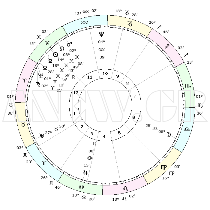 | | ΘΕΣΕΙΣ ΠΛΑΝΗΤΩΝ ΑΣΤΡΟΛΟΓΙΚΟΥ ΧΑΡΤΗ ΤΗΣ ΣΤΙΓΜΗΣ ΑΥΤΗΣ | | | | Πλανήτης | Ζώδιο | Μοίρες | Δεκαήμ. | Σε οίκο | Απόκλιση | | Ακμές των οίκων | | Ηλιος | Ιχθείς | 14°39' | Δεύτερο | 12 | 06 S 03 | | 1ος | 22°33' | Ιχθείς | | Σελήνη | Ζυγός | 05°32' | Πρώτο | 7 | 04 S 22 | | 2ος | 04°32' | Ταύρος | | Ερμής | Ιχθείς | 19°03'R | Δεύτερο | 12 | 00 S 57 | | 3ος | 03°08' | Δίδυμοι | | Αφροδίτη | Ιχθείς | 28°29' | Τρίτο | 1 | 01 S 47 | | 4ος | 25°49' | Δίδυμοι | | Αρης | Ιχθείς | 02°05' | Πρώτο | 12 | 11 S 45 | | 5ος | 17°50' | Καρκίνος | | Δίας | Καρκίνος | 15°09'R | Δεύτερο | 4 | 22 N 55 | | 6ος | 14°08' | Λέων | | Κρόνος | Κριός | 02°21' | Πρώτο | 1 | 01 S 01 | | 7ος | 22°33' | Παρθένος | | Ουρανός | Ταύρος | 27°50' | Τρίτο | 2 | 19 N 30 | | 8ος | 04°32' | Σκορπιός | | Ποσειδώνας | Κριός | 01°12' | Πρώτο | 1 | 00 S 43 | | 9ος | 03°08' | Τοξότης | | Πλούτωνας | Υδροχόος | 04°39' | Πρώτο | 11 | 22 S 51 | | 10ος | 25°49' | Τοξότης | | Β. Δεσμός | Ιχθείς | 08°49' | Πρώτο | 12 | 08 S 16 | | 11ος | 17°50' | Αιγόκερως | | Ωροσκόπος | Ιχθείς | 22°33' | Τρίτο | | | 12ος | 14°08' | Υδροχόος | | Μεσουράνημα | Τοξότης | 25°49' | Τρίτο | | | |