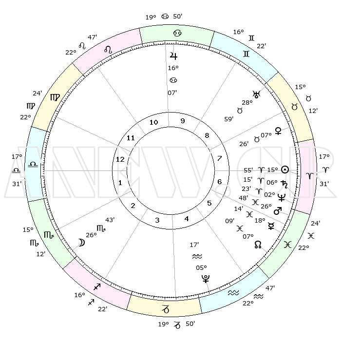 | | ΘΕΣΕΙΣ ΠΛΑΝΗΤΩΝ ΑΣΤΡΟΛΟΓΙΚΟΥ ΧΑΡΤΗ ΤΗΣ ΣΤΙΓΜΗΣ ΑΥΤΗΣ | | | | Πλανήτης | Ζώδιο | Μοίρες | Δεκαήμ. | Σε οίκο | Απόκλιση | | Ακμές των οίκων | | Ηλιος | Κριός | 15°48' | Δεύτερο | 8 | 06 N 13 | | 1ος | 09°17' | Παρθένος | | Σελήνη | Σκορπιός | 25°09' | Τρίτο | 3 | 23 S 56 | | 2ος | 04°05' | Ζυγός | | Ερμής | Ιχθείς | 18°06' | Δεύτερο | 7 | 06 S 29 | | 3ος | 03°30' | Σκορπιός | | Αφροδίτη | Ταύρος | 07°17' | Πρώτο | 9 | 13 N 42 | | 4ος | 06°27' | Τοξότης | | Αρης | Ιχθείς | 26°42' | Τρίτο | 7 | 02 S 15 | | 5ος | 10°05' | Αιγόκερως | | Δίας | Καρκίνος | 16°07' | Δεύτερο | 11 | 22 N 50 | | 6ος | 11°25' | Υδροχόος | | Κρόνος | Κριός | 06°14' | Πρώτο | 8 | 00 N 31 | | 7ος | 09°17' | Ιχθείς | | Ουρανός | Ταύρος | 28°58' | Τρίτο | 9 | 19 N 45 | | 8ος | 04°05' | Κριός | | Ποσειδώνας | Κριός | 02°23' | Πρώτο | 7 | 00 S 15 | | 9ος | 03°30' | Ταύρος | | Πλούτωνας | Υδροχόος | 05°17' | Πρώτο | 5 | 22 S 47 | | 10ος | 06°27' | Δίδυμοι | | Β. Δεσμός | Ιχθείς | 07°10' | Πρώτο | 6 | 08 S 53 | | 11ος | 10°05' | Καρκίνος | | Ωροσκόπος | Παρθένος | 09°17' | Πρώτο | | | 12ος | 11°25' | Λέων | | Μεσουράνημα | Δίδυμοι | 06°27' | Πρώτο | | | |