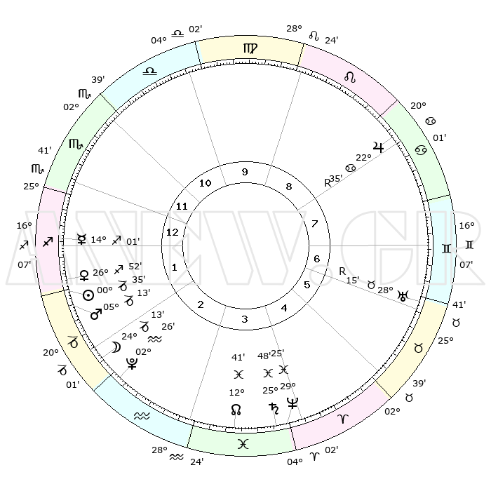 | | ΘΕΣΕΙΣ ΠΛΑΝΗΤΩΝ ΑΣΤΡΟΛΟΓΙΚΟΥ ΧΑΡΤΗ ΤΗΣ ΣΤΙΓΜΗΣ ΑΥΤΗΣ | | | | Πλανήτης | Ζώδιο | Μοίρες | Δεκαήμ. | Σε οίκο | Απόκλιση | | Ακμές των οίκων | | Ηλιος | Αιγόκερως | 00°30' | Πρώτο | 2 | 23 S 26 | | 1ος | 25°05' | Σκορπιός | | Σελήνη | Αιγόκερως | 23°20' | Τρίτο | 2 | 25 S 07 | | 2ος | 25°35' | Τοξότης | | Ερμής | Τοξότης | 13°55' | Δεύτερο | 1 | 21 S 51 | | 3ος | 00°30' | Υδροχόος | | Αφροδίτη | Τοξότης | 26°47' | Τρίτο | 2 | 23 S 31 | | 4ος | 06°23' | Ιχθείς | | Αρης | Αιγόκερως | 05°10' | Πρώτο | 2 | 24 S 09 | | 5ος | 07°58' | Κριός | | Δίας | Καρκίνος | 22°35'R | Τρίτο | 8 | 21 N 45 | | 6ος | 03°41' | Ταύρος | | Κρόνος | Ιχθείς | 25°47' | Τρίτο | 4 | 03 S 47 | | 7ος | 25°05' | Ταύρος | | Ουρανός | Ταύρος | 28°15'R | Τρίτο | 7 | 19 N 34 | | 8ος | 25°35' | Δίδυμοι | | Ποσειδώνας | Ιχθείς | 29°25' | Τρίτο | 4 | 01 S 28 | | 9ος | 00°30' | Λέων | | Πλούτωνας | Υδροχόος | 02°26' | Πρώτο | 3 | 23 S 17 | | 10ος | 06°23' | Παρθένος | | Β. Δεσμός | Ιχθείς | 12°42' | Δεύτερο | 4 | 06 S 48 | | 11ος | 07°58' | Ζυγός | | Ωροσκόπος | Σκορπιός | 25°05' | Τρίτο | | | 12ος | 03°41' | Σκορπιός | | Μεσουράνημα | Παρθένος | 06°23' | Πρώτο | | | |