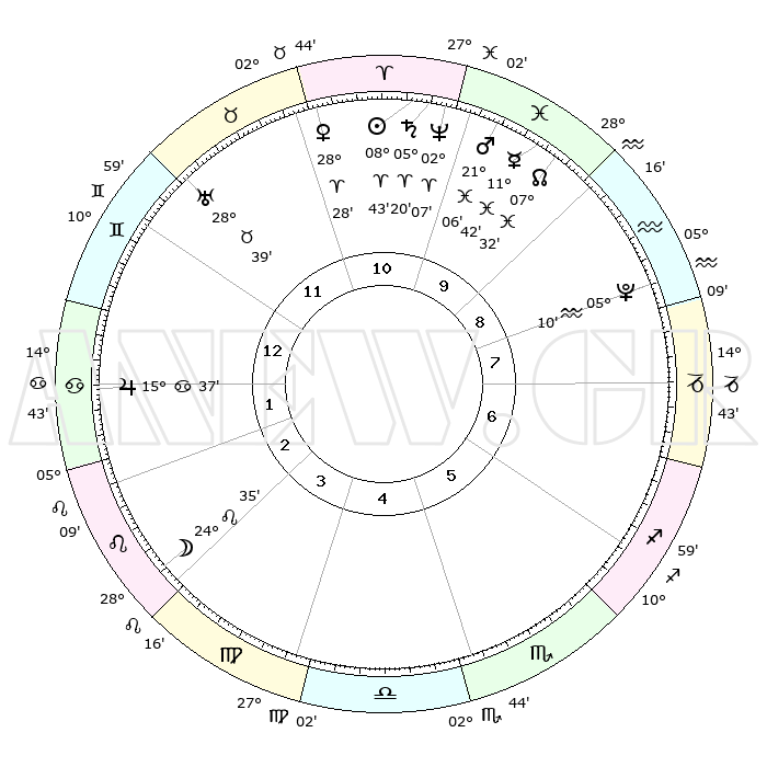 | | ΘΕΣΕΙΣ ΠΛΑΝΗΤΩΝ ΑΣΤΡΟΛΟΓΙΚΟΥ ΧΑΡΤΗ ΤΗΣ ΣΤΙΓΜΗΣ ΑΥΤΗΣ | | | | Πλανήτης | Ζώδιο | Μοίρες | Δεκαήμ. | Σε οίκο | Απόκλιση | | Ακμές των οίκων | | Ηλιος | Κριός | 08°40' | Πρώτο | 10 | 03 N 26 | | 1ος | 27°11' | Δίδυμοι | | Σελήνη | Λέων | 23°51' | Τρίτο | 3 | 14 N 50 | | 2ος | 18°10' | Καρκίνος | | Ερμής | Ιχθείς | 11°40' | Δεύτερο | 10 | 07 S 59 | | 3ος | 09°48' | Λέων | | Αφροδίτη | Κριός | 28°23' | Τρίτο | 11 | 10 N 23 | | 4ος | 05°40' | Παρθένος | | Αρης | Ιχθείς | 21°03' | Τρίτο | 10 | 04 S 31 | | 5ος | 09°09' | Ζυγός | | Δίας | Καρκίνος | 15°37' | Δεύτερο | 1 | 22 N 53 | | 6ος | 19°19' | Σκορπιός | | Κρόνος | Κριός | 05°20' | Πρώτο | 10 | 00 N 10 | | 7ος | 27°11' | Τοξότης | | Ουρανός | Ταύρος | 28°39' | Τρίτο | 12 | 19 N 41 | | 8ος | 18°10' | Αιγόκερως | | Ποσειδώνας | Κριός | 02°07' | Πρώτο | 10 | 00 S 22 | | 9ος | 09°48' | Υδροχόος | | Πλούτωνας | Υδροχόος | 05°10' | Πρώτο | 8 | 22 S 48 | | 10ος | 05°40' | Ιχθείς | | Β. Δεσμός | Ιχθείς | 07°33' | Πρώτο | 10 | 08 S 44 | | 11ος | 09°09' | Κριός | | Ωροσκόπος | Δίδυμοι | 27°11' | Τρίτο | | | 12ος | 19°19' | Ταύρος | | Μεσουράνημα | Ιχθείς | 05°40' | Πρώτο | | | |