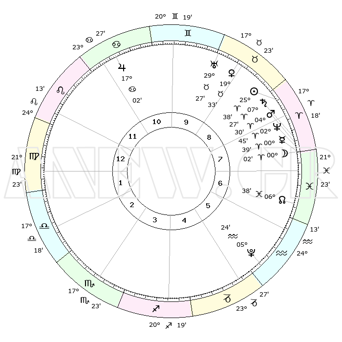 | | ΘΕΣΕΙΣ ΠΛΑΝΗΤΩΝ ΑΣΤΡΟΛΟΓΙΚΟΥ ΧΑΡΤΗ ΤΗΣ ΣΤΙΓΜΗΣ ΑΥΤΗΣ | | | | Πλανήτης | Ζώδιο | Μοίρες | Δεκαήμ. | Σε οίκο | Απόκλιση | | Ακμές των οίκων | | Ηλιος | Κριός | 25°33' | Τρίτο | 9 | 09 N 52 | | 1ος | 26°48' | Λέων | | Σελήνη | Ιχθείς | 28°51' | Τρίτο | 8 | 01 N 13 | | 2ος | 20°19' | Παρθένος | | Ερμής | Κριός | 00°32' | Πρώτο | 8 | 02 S 11 | | 3ος | 18°41' | Ζυγός | | Αφροδίτη | Ταύρος | 19°27' | Δεύτερο | 9 | 17 N 46 | | 4ος | 21°33' | Σκορπιός | | Αρης | Κριός | 04°26' | Πρώτο | 8 | 00 N 52 | | 5ος | 25°58' | Τοξότης | | Δίας | Καρκίνος | 17°01' | Δεύτερο | 11 | 22 N 44 | | 6ος | 28°11' | Αιγόκερως | | Κρόνος | Κριός | 07°27' | Πρώτο | 8 | 00 N 59 | | 7ος | 26°48' | Υδροχόος | | Ουρανός | Ταύρος | 29°27' | Τρίτο | 10 | 19 N 52 | | 8ος | 20°19' | Ιχθείς | | Ποσειδώνας | Κριός | 02°45' | Πρώτο | 8 | 00 S 07 | | 9ος | 18°41' | Κριός | | Πλούτωνας | Υδροχόος | 05°24' | Πρώτο | 6 | 22 S 47 | | 10ος | 21°33' | Ταύρος | | Β. Δεσμός | Ιχθείς | 06°38' | Πρώτο | 7 | 09 S 04 | | 11ος | 25°58' | Δίδυμοι | | Ωροσκόπος | Λέων | 26°48' | Τρίτο | | | 12ος | 28°11' | Καρκίνος | | Μεσουράνημα | Ταύρος | 21°33' | Τρίτο | | | |