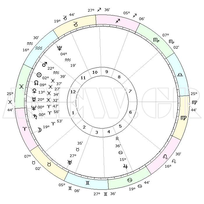 | | ΘΕΣΕΙΣ ΠΛΑΝΗΤΩΝ ΑΣΤΡΟΛΟΓΙΚΟΥ ΧΑΡΤΗ ΤΗΣ ΣΤΙΓΜΗΣ ΑΥΤΗΣ | | | | Πλανήτης | Ζώδιο | Μοίρες | Δεκαήμ. | Σε οίκο | Απόκλιση | | Ακμές των οίκων | | Ηλιος | Ιχθείς | 02°33' | Πρώτο | 1 | 10 S 34 | | 1ος | 15°26' | Υδροχόος | | Σελήνη | Κριός | 18°52' | Δεύτερο | 2 | 10 N 32 | | 2ος | 01°09' | Κριός | | Ερμής | Ιχθείς | 20°29' | Τρίτο | 1 | 02 S 21 | | 3ος | 06°47' | Ταύρος | | Αφροδίτη | Ιχθείς | 13°28' | Δεύτερο | 1 | 07 S 50 | | 4ος | 02°52' | Δίδυμοι | | Αρης | Υδροχόος | 22°36' | Τρίτο | 1 | 15 S 00 | | 5ος | 24°49' | Δίδυμοι | | Δίας | Καρκίνος | 15°36'R | Δεύτερο | 5 | 22 N 51 | | 6ος | 17°06' | Καρκίνος | | Κρόνος | Κριός | 00°55' | Πρώτο | 1 | 01 S 36 | | 7ος | 15°26' | Λέων | | Ουρανός | Ταύρος | 27°35' | Τρίτο | 3 | 19 N 26 | | 8ος | 01°09' | Ζυγός | | Ποσειδώνας | Κριός | 00°46' | Πρώτο | 1 | 00 S 54 | | 9ος | 06°47' | Σκορπιός | | Πλούτωνας | Υδροχόος | 04°19' | Πρώτο | 12 | 22 S 55 | | 10ος | 02°52' | Τοξότης | | Β. Δεσμός | Ιχθείς | 09°28' | Πρώτο | 1 | 08 S 01 | | 11ος | 24°49' | Τοξότης | | Ωροσκόπος | Υδροχόος | 15°26' | Δεύτερο | | | 12ος | 17°06' | Αιγόκερως | | Μεσουράνημα | Τοξότης | 02°52' | Πρώτο | | | |