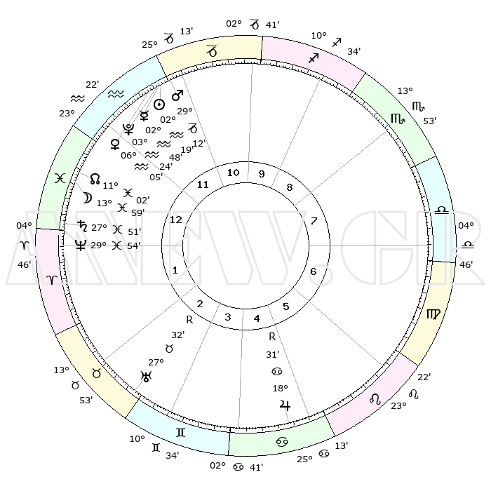 | | ΘΕΣΕΙΣ ΠΛΑΝΗΤΩΝ ΑΣΤΡΟΛΟΓΙΚΟΥ ΧΑΡΤΗ ΤΗΣ ΣΤΙΓΜΗΣ ΑΥΤΗΣ | | | | Πλανήτης | Ζώδιο | Μοίρες | Δεκαήμ. | Σε οίκο | Απόκλιση | | Ακμές των οίκων | | Ηλιος | Υδροχόος | 02°15' | Πρώτο | 12 | 19 S 39 | | 1ος | 20°58' | Υδροχόος | | Σελήνη | Ιχθείς | 12°57' | Δεύτερο | 1 | 06 S 23 | | 2ος | 06°47' | Κριός | | Ερμής | Υδροχόος | 02°40' | Πρώτο | 12 | 21 S 34 | | 3ος | 11°18' | Ταύρος | | Αφροδίτη | Υδροχόος | 05°59' | Πρώτο | 12 | 19 S 55 | | 4ος | 06°41' | Δίδυμοι | | Αρης | Αιγόκερως | 29°09' | Τρίτο | 12 | 21 S 18 | | 5ος | 28°29' | Δίδυμοι | | Δίας | Καρκίνος | 18°31'R | Δεύτερο | 5 | 22 N 26 | | 6ος | 21°12' | Καρκίνος | | Κρόνος | Ιχθείς | 27°51' | Τρίτο | 1 | 02 S 52 | | 7ος | 20°58' | Λέων | | Ουρανός | Ταύρος | 27°32'R | Τρίτο | 3 | 19 N 25 | | 8ος | 06°47' | Ζυγός | | Ποσειδώνας | Ιχθείς | 29°54' | Τρίτο | 1 | 01 S 15 | | 9ος | 11°18' | Σκορπιός | | Πλούτωνας | Υδροχόος | 03°23' | Πρώτο | 12 | 23 S 05 | | 10ος | 06°41' | Τοξότης | | Β. Δεσμός | Ιχθείς | 11°03' | Δεύτερο | 1 | 07 S 25 | | 11ος | 28°29' | Τοξότης | | Ωροσκόπος | Υδροχόος | 20°58' | Τρίτο | | | 12ος | 21°12' | Αιγόκερως | | Μεσουράνημα | Τοξότης | 06°41' | Πρώτο | | | |