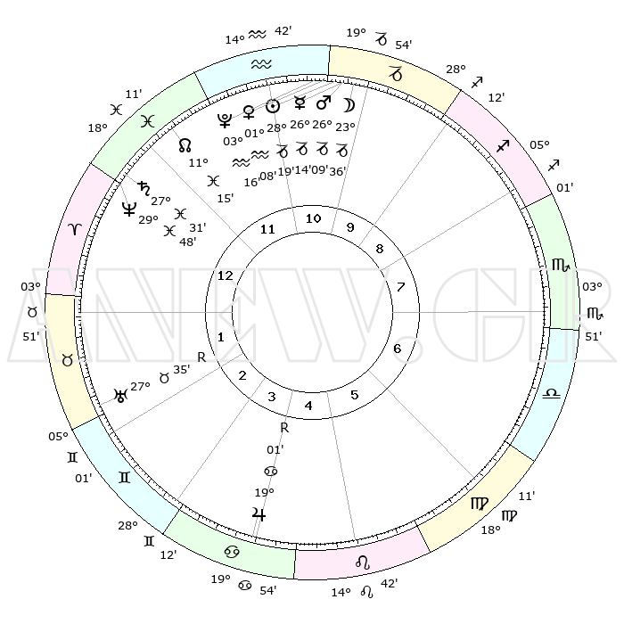 | | ΘΕΣΕΙΣ ΠΛΑΝΗΤΩΝ ΑΣΤΡΟΛΟΓΙΚΟΥ ΧΑΡΤΗ ΤΗΣ ΣΤΙΓΜΗΣ ΑΥΤΗΣ | | | | Πλανήτης | Ζώδιο | Μοίρες | Δεκαήμ. | Σε οίκο | Απόκλιση | | Ακμές των οίκων | | Ηλιος | Αιγόκερως | 28°15' | Τρίτο | 11 | 20 S 30 | | 1ος | 29°09' | Ιχθείς | | Σελήνη | Αιγόκερως | 22°51' | Τρίτο | 11 | 25 S 12 | | 2ος | 09°39' | Ταύρος | | Ερμής | Αιγόκερως | 26°08' | Τρίτο | 11 | 22 S 50 | | 3ος | 07°11' | Δίδυμοι | | Αφροδίτη | Υδροχόος | 01°03' | Πρώτο | 11 | 20 S 58 | | 4ος | 29°31' | Δίδυμοι | | Αρης | Αιγόκερως | 26°06' | Τρίτο | 11 | 21 S 54 | | 5ος | 21°47' | Καρκίνος | | Δίας | Καρκίνος | 19°02'R | Δεύτερο | 4 | 22 N 21 | | 6ος | 19°04' | Λέων | | Κρόνος | Ιχθείς | 27°31' | Τρίτο | 12 | 03 S 01 | | 7ος | 29°09' | Παρθένος | | Ουρανός | Ταύρος | 27°35'R | Τρίτο | 2 | 19 N 26 | | 8ος | 09°39' | Σκορπιός | | Ποσειδώνας | Ιχθείς | 29°48' | Τρίτο | 1 | 01 S 17 | | 9ος | 07°11' | Τοξότης | | Πλούτωνας | Υδροχόος | 03°16' | Πρώτο | 11 | 23 S 06 | | 10ος | 29°31' | Τοξότης | | Β. Δεσμός | Ιχθείς | 11°15' | Δεύτερο | 12 | 07 S 21 | | 11ος | 21°47' | Αιγόκερως | | Ωροσκόπος | Ιχθείς | 29°09' | Τρίτο | | | 12ος | 19°04' | Υδροχόος | | Μεσουράνημα | Τοξότης | 29°31' | Τρίτο | | | |
