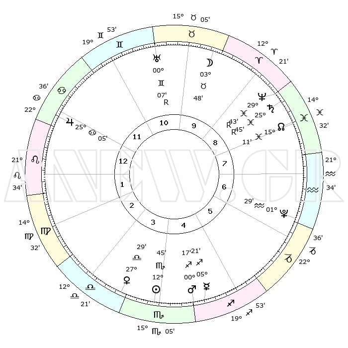| | ΘΕΣΕΙΣ ΠΛΑΝΗΤΩΝ ΑΣΤΡΟΛΟΓΙΚΟΥ ΧΑΡΤΗ ΤΗΣ ΣΤΙΓΜΗΣ ΑΥΤΗΣ | | | | Πλανήτης | Ζώδιο | Μοίρες | Δεκαήμ. | Σε οίκο | Απόκλιση | | Ακμές των οίκων | | Ηλιος | Σκορπιός | 12°39' | Δεύτερο | 5 | 15 S 38 | | 1ος | 19°19' | Καρκίνος | | Σελήνη | Ταύρος | 02°07' | Πρώτο | 10 | 15 N 36 | | 2ος | 09°51' | Λέων | | Ερμής | Τοξότης | 05°17' | Πρώτο | 5 | 23 S 57 | | 3ος | 03°30' | Παρθένος | | Αφροδίτη | Ζυγός | 27°21' | Τρίτο | 4 | 09 S 12 | | 4ος | 03°01' | Ζυγός | | Αρης | Τοξότης | 00°13' | Πρώτο | 5 | 20 S 37 | | 5ος | 08°58' | Σκορπιός | | Δίας | Καρκίνος | 25°04' | Τρίτο | 1 | 21 N 12 | | 6ος | 16°29' | Τοξότης | | Κρόνος | Ιχθείς | 25°46'R | Τρίτο | 9 | 03 S 56 | | 7ος | 19°19' | Αιγόκερως | | Ουρανός | Δίδυμοι | 00°07'R | Πρώτο | 11 | 19 N 58 | | 8ος | 09°51' | Υδροχόος | | Ποσειδώνας | Ιχθείς | 29°43'R | Τρίτο | 9 | 01 S 22 | | 9ος | 03°30' | Ιχθείς | | Πλούτωνας | Υδροχόος | 01°29' | Πρώτο | 7 | 23 S 30 | | 10ος | 03°01' | Κριός | | Β. Δεσμός | Ιχθείς | 15°12' | Δεύτερο | 9 | 05 S 50 | | 11ος | 08°58' | Ταύρος | | Ωροσκόπος | Καρκίνος | 19°19' | Δεύτερο | | | 12ος | 16°29' | Δίδυμοι | | Μεσουράνημα | Κριός | 03°01' | Πρώτο | | | |