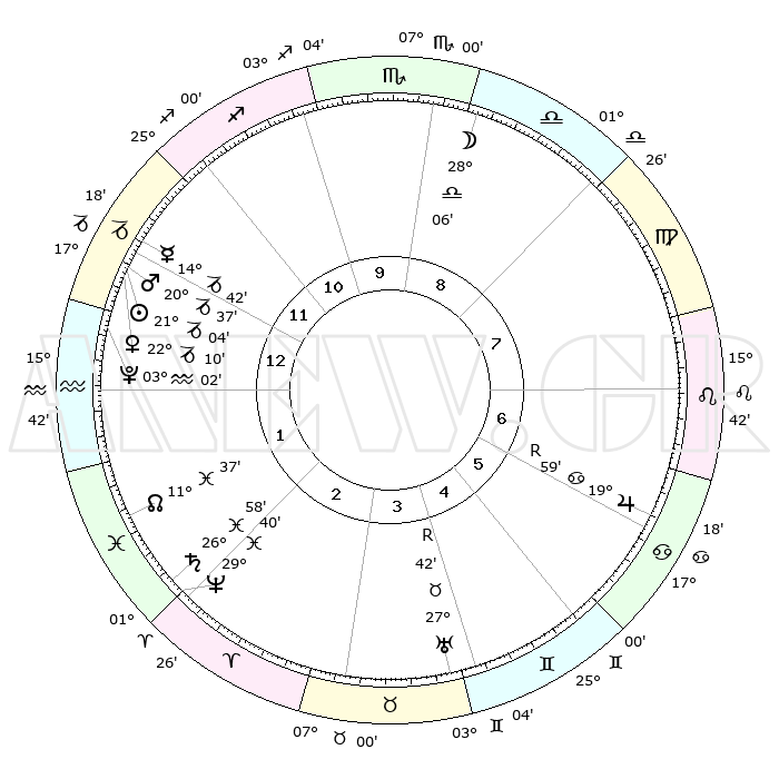 | | ΘΕΣΕΙΣ ΠΛΑΝΗΤΩΝ ΑΣΤΡΟΛΟΓΙΚΟΥ ΧΑΡΤΗ ΤΗΣ ΣΤΙΓΜΗΣ ΑΥΤΗΣ | | | | Πλανήτης | Ζώδιο | Μοίρες | Δεκαήμ. | Σε οίκο | Απόκλιση | | Ακμές των οίκων | | Ηλιος | Αιγόκερως | 20°33' | Τρίτο | 5 | 21 S 52 | | 1ος | 04°35' | Παρθένος | | Σελήνη | Ζυγός | 22°01' | Τρίτο | 2 | 11 S 44 | | 2ος | 28°54' | Παρθένος | | Ερμής | Αιγόκερως | 13°54' | Δεύτερο | 5 | 24 S 12 | | 3ος | 27°58' | Ζυγός | | Αφροδίτη | Αιγόκερως | 21°32' | Τρίτο | 5 | 22 S 33 | | 4ος | 00°55' | Τοξότης | | Αρης | Αιγόκερως | 20°14' | Τρίτο | 5 | 22 S 51 | | 5ος | 04°49' | Αιγόκερως | | Δίας | Καρκίνος | 20°03'R | Τρίτο | 11 | 22 N 12 | | 6ος | 06°26' | Υδροχόος | | Κρόνος | Ιχθείς | 26°56' | Τρίτο | 7 | 03 S 16 | | 7ος | 04°35' | Ιχθείς | | Ουρανός | Ταύρος | 27°43'R | Τρίτο | 9 | 19 N 27 | | 8ος | 28°54' | Ιχθείς | | Ποσειδώνας | Ιχθείς | 29°39' | Τρίτο | 8 | 01 S 21 | | 9ος | 27°58' | Κριός | | Πλούτωνας | Υδροχόος | 03°01' | Πρώτο | 5 | 23 S 09 | | 10ος | 00°55' | Δίδυμοι | | Β. Δεσμός | Ιχθείς | 11°39' | Δεύτερο | 7 | 07 S 12 | | 11ος | 04°49' | Καρκίνος | | Ωροσκόπος | Παρθένος | 04°35' | Πρώτο | | | 12ος | 06°26' | Λέων | | Μεσουράνημα | Δίδυμοι | 00°55' | Πρώτο | | | |