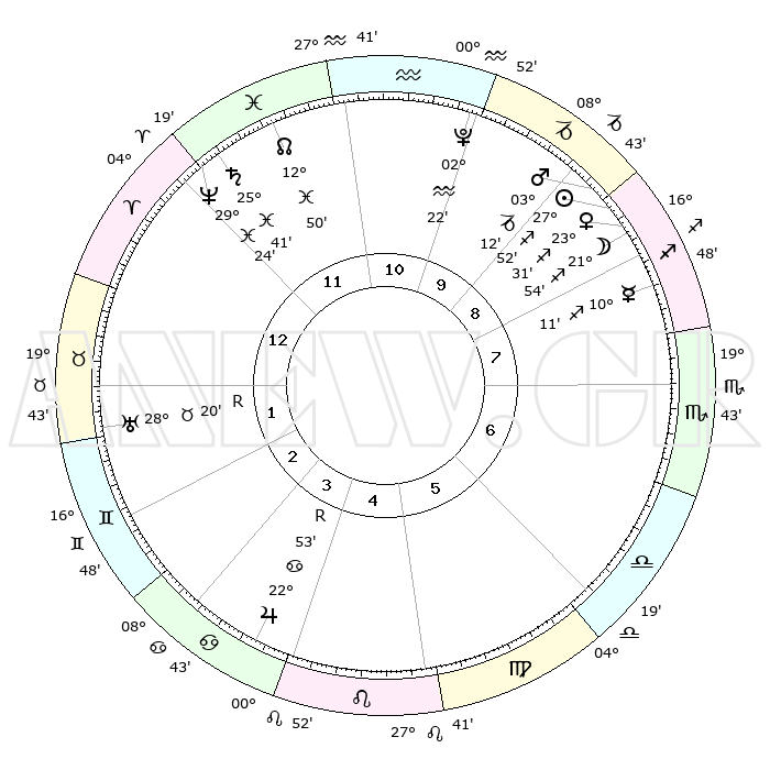 | | ΘΕΣΕΙΣ ΠΛΑΝΗΤΩΝ ΑΣΤΡΟΛΟΓΙΚΟΥ ΧΑΡΤΗ ΤΗΣ ΣΤΙΓΜΗΣ ΑΥΤΗΣ | | | | Πλανήτης | Ζώδιο | Μοίρες | Δεκαήμ. | Σε οίκο | Απόκλιση | | Ακμές των οίκων | | Ηλιος | Τοξότης | 27°48' | Τρίτο | 9 | 23 S 25 | | 1ος | 11°00' | Κριός | | Σελήνη | Τοξότης | 21°02' | Τρίτο | 9 | 28 S 04 | | 2ος | 18°29' | Ταύρος | | Ερμής | Τοξότης | 10°05' | Δεύτερο | 8 | 21 S 00 | | 3ος | 14°18' | Δίδυμοι | | Αφροδίτη | Τοξότης | 23°26' | Τρίτο | 9 | 23 S 17 | | 4ος | 06°12' | Καρκίνος | | Αρης | Αιγόκερως | 03°08' | Πρώτο | 9 | 24 S 12 | | 5ος | 29°06' | Καρκίνος | | Δίας | Καρκίνος | 22°53'R | Τρίτο | 4 | 21 N 42 | | 6ος | 28°17' | Λέων | | Κρόνος | Ιχθείς | 25°41' | Τρίτο | 12 | 03 S 50 | | 7ος | 11°00' | Ζυγός | | Ουρανός | Ταύρος | 28°20'R | Τρίτο | 2 | 19 N 35 | | 8ος | 18°29' | Σκορπιός | | Ποσειδώνας | Ιχθείς | 29°24' | Τρίτο | 12 | 01 S 28 | | 9ος | 14°18' | Τοξότης | | Πλούτωνας | Υδροχόος | 02°22' | Πρώτο | 11 | 23 S 18 | | 10ος | 06°12' | Αιγόκερως | | Β. Δεσμός | Ιχθείς | 12°50' | Δεύτερο | 12 | 06 S 44 | | 11ος | 29°06' | Αιγόκερως | | Ωροσκόπος | Κριός | 11°00' | Δεύτερο | | | 12ος | 28°17' | Υδροχόος | | Μεσουράνημα | Αιγόκερως | 06°12' | Πρώτο | | | |