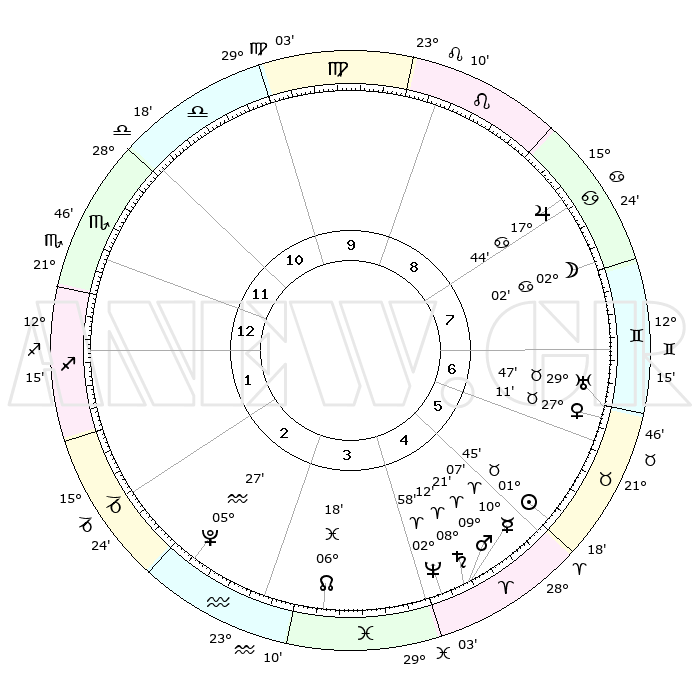 | | ΘΕΣΕΙΣ ΠΛΑΝΗΤΩΝ ΑΣΤΡΟΛΟΓΙΚΟΥ ΧΑΡΤΗ ΤΗΣ ΣΤΙΓΜΗΣ ΑΥΤΗΣ | | | | Πλανήτης | Ζώδιο | Μοίρες | Δεκαήμ. | Σε οίκο | Απόκλιση | | Ακμές των οίκων | | Ηλιος | Ταύρος | 01°41' | Πρώτο | 6 | 12 N 03 | | 1ος | 21°37' | Σκορπιός | | Σελήνη | Καρκίνος | 01°00' | Πρώτο | 8 | 28 N 06 | | 2ος | 21°43' | Τοξότης | | Ερμής | Κριός | 10°00' | Δεύτερο | 5 | 01 N 35 | | 3ος | 26°06' | Αιγόκερως | | Αφροδίτη | Ταύρος | 27°06' | Τρίτο | 7 | 19 N 59 | | 4ος | 01°48' | Ιχθείς | | Αρης | Κριός | 09°17' | Πρώτο | 5 | 02 N 49 | | 5ος | 03°44' | Κριός | | Δίας | Καρκίνος | 17°43' | Δεύτερο | 8 | 22 N 38 | | 6ος | 29°55' | Κριός | | Κρόνος | Κριός | 08°12' | Πρώτο | 5 | 01 N 16 | | 7ος | 21°37' | Ταύρος | | Ουρανός | Ταύρος | 29°46' | Τρίτο | 7 | 19 N 56 | | 8ος | 21°43' | Δίδυμοι | | Ποσειδώνας | Κριός | 02°58' | Πρώτο | 4 | 00 S 02 | | 9ος | 26°06' | Καρκίνος | | Πλούτωνας | Υδροχόος | 05°27' | Πρώτο | 3 | 22 S 48 | | 10ος | 01°48' | Παρθένος | | Β. Δεσμός | Ιχθείς | 06°18' | Πρώτο | 4 | 09 S 12 | | 11ος | 03°44' | Ζυγός | | Ωροσκόπος | Σκορπιός | 21°37' | Τρίτο | | | 12ος | 29°55' | Ζυγός | | Μεσουράνημα | Παρθένος | 01°48' | Πρώτο | | | |