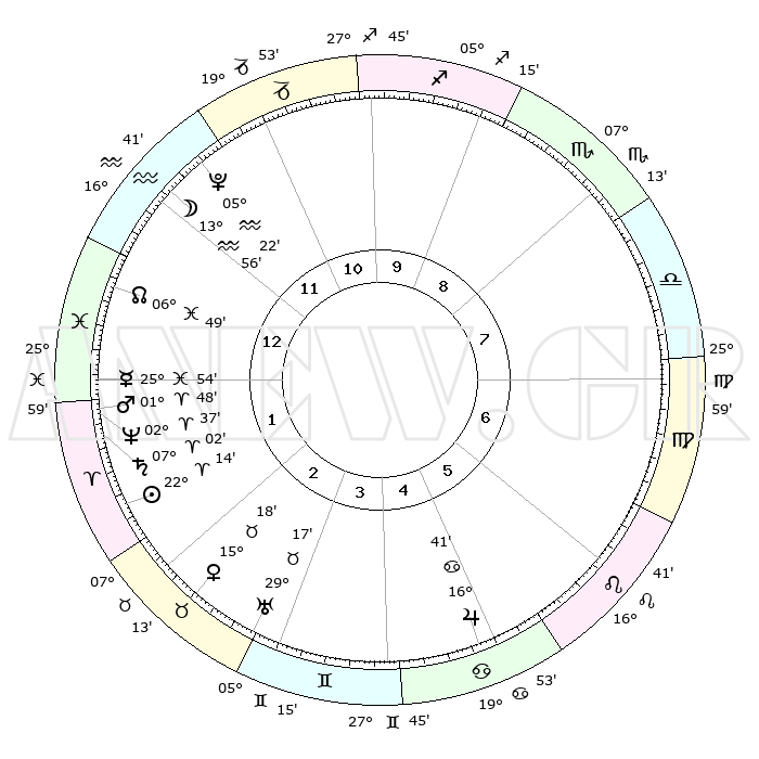 | | ΘΕΣΕΙΣ ΠΛΑΝΗΤΩΝ ΑΣΤΡΟΛΟΓΙΚΟΥ ΧΑΡΤΗ ΤΗΣ ΣΤΙΓΜΗΣ ΑΥΤΗΣ | | | | Πλανήτης | Ζώδιο | Μοίρες | Δεκαήμ. | Σε οίκο | Απόκλιση | | Ακμές των οίκων | | Ηλιος | Κριός | 22°10' | Τρίτο | 2 | 08 N 38 | | 1ος | 18°01' | Υδροχόος | | Σελήνη | Υδροχόος | 13°05' | Δεύτερο | 12 | 18 S 59 | | 2ος | 03°49' | Κριός | | Ερμής | Ιχθείς | 25°49' | Τρίτο | 1 | 03 S 56 | | 3ος | 08°56' | Ταύρος | | Αφροδίτη | Ταύρος | 15°13' | Δεύτερο | 3 | 16 N 26 | | 4ος | 04°41' | Δίδυμοι | | Αρης | Κριός | 01°45' | Πρώτο | 1 | 00 S 13 | | 5ος | 26°33' | Δίδυμοι | | Δίας | Καρκίνος | 16°40' | Δεύτερο | 5 | 22 N 46 | | 6ος | 19°01' | Καρκίνος | | Κρόνος | Κριός | 07°02' | Πρώτο | 2 | 00 N 49 | | 7ος | 18°02' | Λέων | | Ουρανός | Ταύρος | 29°17' | Τρίτο | 3 | 19 N 50 | | 8ος | 03°49' | Ζυγός | | Ποσειδώνας | Κριός | 02°37' | Πρώτο | 1 | 00 S 10 | | 9ος | 08°56' | Σκορπιός | | Πλούτωνας | Υδροχόος | 05°22' | Πρώτο | 12 | 22 S 47 | | 10ος | 04°41' | Τοξότης | | Β. Δεσμός | Ιχθείς | 06°49' | Πρώτο | 1 | 09 S 00 | | 11ος | 26°33' | Τοξότης | | Ωροσκόπος | Υδροχόος | 18°01' | Δεύτερο | | | 12ος | 19°01' | Αιγόκερως | | Μεσουράνημα | Τοξότης | 04°41' | Πρώτο | | | |