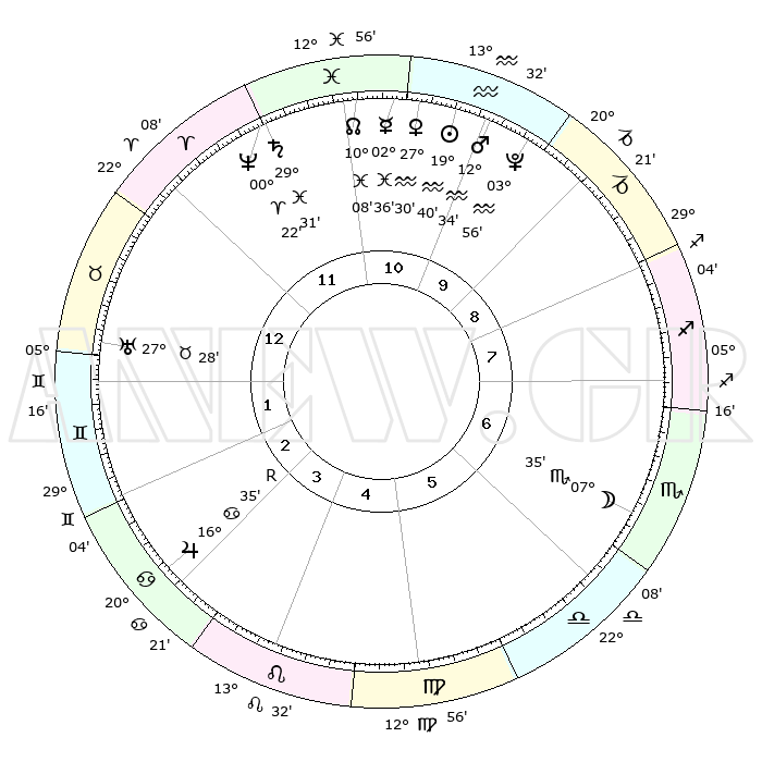 | | ΘΕΣΕΙΣ ΠΛΑΝΗΤΩΝ ΑΣΤΡΟΛΟΓΙΚΟΥ ΧΑΡΤΗ ΤΗΣ ΣΤΙΓΜΗΣ ΑΥΤΗΣ | | | | Πλανήτης | Ζώδιο | Μοίρες | Δεκαήμ. | Σε οίκο | Απόκλιση | | Ακμές των οίκων | | Ηλιος | Υδροχόος | 19°36' | Δεύτερο | 11 | 14 S 56 | | 1ος | 05°09' | Ταύρος | | Σελήνη | Σκορπιός | 06°48' | Πρώτο | 7 | 17 S 58 | | 2ος | 05°58' | Δίδυμοι | | Ερμής | Ιχθείς | 02°29' | Πρώτο | 11 | 11 S 40 | | 3ος | 29°01' | Δίδυμοι | | Αφροδίτη | Υδροχόος | 27°25' | Τρίτο | 11 | 13 S 43 | | 4ος | 20°45' | Καρκίνος | | Αρης | Υδροχόος | 12°31' | Δεύτερο | 10 | 18 S 04 | | 5ος | 15°41' | Λέων | | Δίας | Καρκίνος | 16°36'R | Δεύτερο | 3 | 22 N 43 | | 6ος | 19°26' | Παρθένος | | Κρόνος | Ιχθείς | 29°30' | Τρίτο | 12 | 02 S 11 | | 7ος | 05°09' | Σκορπιός | | Ουρανός | Ταύρος | 27°28' | Τρίτο | 1 | 19 N 24 | | 8ος | 05°58' | Τοξότης | | Ποσειδώνας | Κριός | 00°21' | Πρώτο | 12 | 01 S 04 | | 9ος | 29°01' | Τοξότης | | Πλούτωνας | Υδροχόος | 03°56' | Πρώτο | 10 | 22 S 59 | | 10ος | 20°45' | Αιγόκερως | | Β. Δεσμός | Ιχθείς | 10°08' | Δεύτερο | 11 | 07 S 46 | | 11ος | 15°41' | Υδροχόος | | Ωροσκόπος | Ταύρος | 05°09' | Πρώτο | | | 12ος | 19°26' | Ιχθείς | | Μεσουράνημα | Αιγόκερως | 20°45' | Τρίτο | | | |