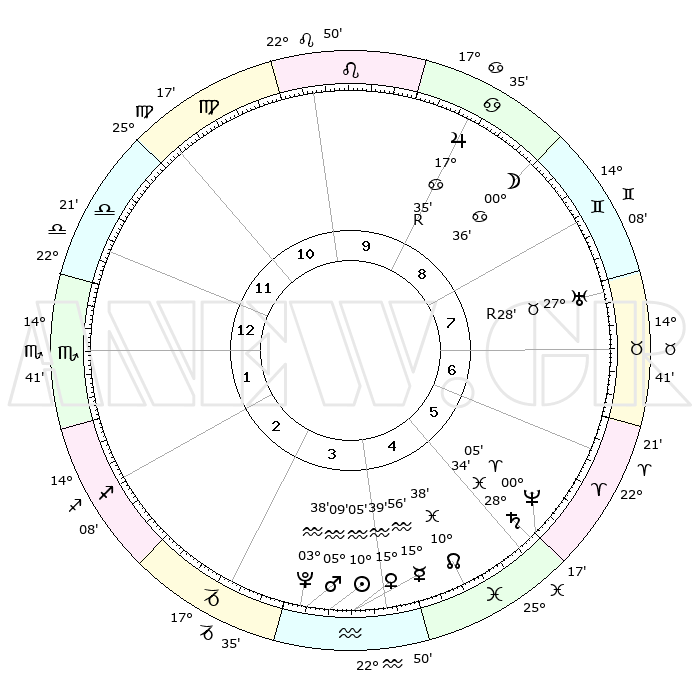 | | ΘΕΣΕΙΣ ΠΛΑΝΗΤΩΝ ΑΣΤΡΟΛΟΓΙΚΟΥ ΧΑΡΤΗ ΤΗΣ ΣΤΙΓΜΗΣ ΑΥΤΗΣ | | | | Πλανήτης | Ζώδιο | Μοίρες | Δεκαήμ. | Σε οίκο | Απόκλιση | | Ακμές των οίκων | | Ηλιος | Υδροχόος | 10°01' | Δεύτερο | 4 | 17 S 44 | | 1ος | 27°58' | Ζυγός | | Σελήνη | Δίδυμοι | 29°45' | Τρίτο | 9 | 28 N 19 | | 2ος | 26°16' | Σκορπιός | | Ερμής | Υδροχόος | 15°50' | Δεύτερο | 4 | 17 S 59 | | 3ος | 28°04' | Τοξότης | | Αφροδίτη | Υδροχόος | 15°35' | Δεύτερο | 4 | 17 S 26 | | 4ος | 02°07' | Υδροχόος | | Αρης | Υδροχόος | 05°07' | Πρώτο | 4 | 19 S 59 | | 5ος | 05°03' | Ιχθείς | | Δίας | Καρκίνος | 17°35'R | Δεύτερο | 9 | 22 N 35 | | 6ος | 03°54' | Κριός | | Κρόνος | Ιχθείς | 28°33' | Τρίτο | 5 | 02 S 34 | | 7ος | 27°58' | Κριός | | Ουρανός | Ταύρος | 27°28'R | Τρίτο | 8 | 19 N 24 | | 8ος | 26°16' | Ταύρος | | Ποσειδώνας | Κριός | 00°05' | Πρώτο | 5 | 01 S 10 | | 9ος | 28°04' | Δίδυμοι | | Πλούτωνας | Υδροχόος | 03°38' | Πρώτο | 4 | 23 S 02 | | 10ος | 02°07' | Λέων | | Β. Δεσμός | Ιχθείς | 10°38' | Δεύτερο | 5 | 07 S 35 | | 11ος | 05°03' | Παρθένος | | Ωροσκόπος | Ζυγός | 27°58' | Τρίτο | | | 12ος | 03°54' | Ζυγός | | Μεσουράνημα | Λέων | 02°07' | Πρώτο | | | |