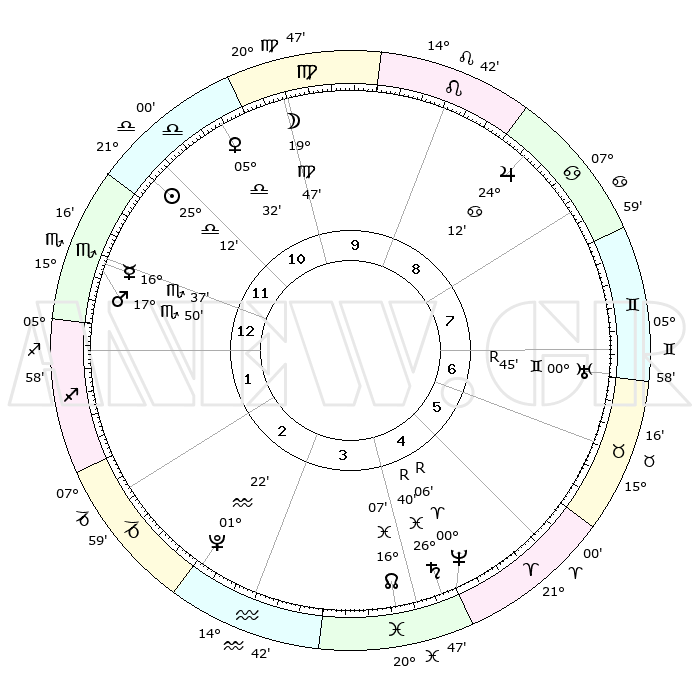 | ΘΕΣΕΙΣ ΠΛΑΝΗΤΩΝ ΑΣΤΡΟΛΟΓΙΚΟΥ ΧΑΡΤΗ ΤΗΣ ΣΤΙΓΜΗΣ ΑΥΤΗΣ | | Πλανήτης | Ζώδιο | Μοίρες | Δεκαήμ. | Σε οίκο | Απόκλιση | | Ακμές των οίκων | Ηλιος | Ζυγός | 24°50' | Τρίτο | 3 | 09 S 37 | | 1ος | 16°35' | Λέων | Σελήνη | Παρθένος | 15°09' | Δεύτερο | 2 | 06 N 06 | | 2ος | 09°03' | Παρθένος | Ερμής | Σκορπιός | 16°07' | Δεύτερο | 4 | 18 S 36 | | 3ος | 06°17' | Ζυγός | Αφροδίτη | Ζυγός | 05°04' | Πρώτο | 2 | 00 S 37 | | 4ος | 08°48' | Σκορπιός | Αρης | Σκορπιός | 17°34' | Δεύτερο | 4 | 17 S 19 | | 5ος | 13°57' | Τοξότης | Δίας | Καρκίνος | 24°10' | Τρίτο | 12 | 21 N 20 | | 6ος | 17°15' | Αιγόκερως | Κρόνος | Ιχθείς | 26°42'R | Τρίτο | 8 | 03 S 36 | | 7ος | 16°35' | Υδροχόος | Ουρανός | Δίδυμοι | 00°46'R | Πρώτο | 10 | 20 N 06 | | 8ος | 09°03' | Ιχθείς | Ποσειδώνας | Κριός | 00°06'R | Πρώτο | 8 | 01 S 13 | | 9ος | 06°17' | Κριός | Πλούτωνας | Υδροχόος | 01°22' | Πρώτο | 6 | 23 S 32 | | 10ος | 08°48' | Ταύρος | Β. Δεσμός | Ιχθείς | 16°09' | Δεύτερο | 8 | 05 S 28 | | 11ος | 13°57' | Δίδυμοι | Ωροσκόπος | Λέων | 16°35' | Δεύτερο | | | 12ος | 17°15' | Καρκίνος | Μεσουράνημα | Ταύρος | 08°48' | Πρώτο | | | |