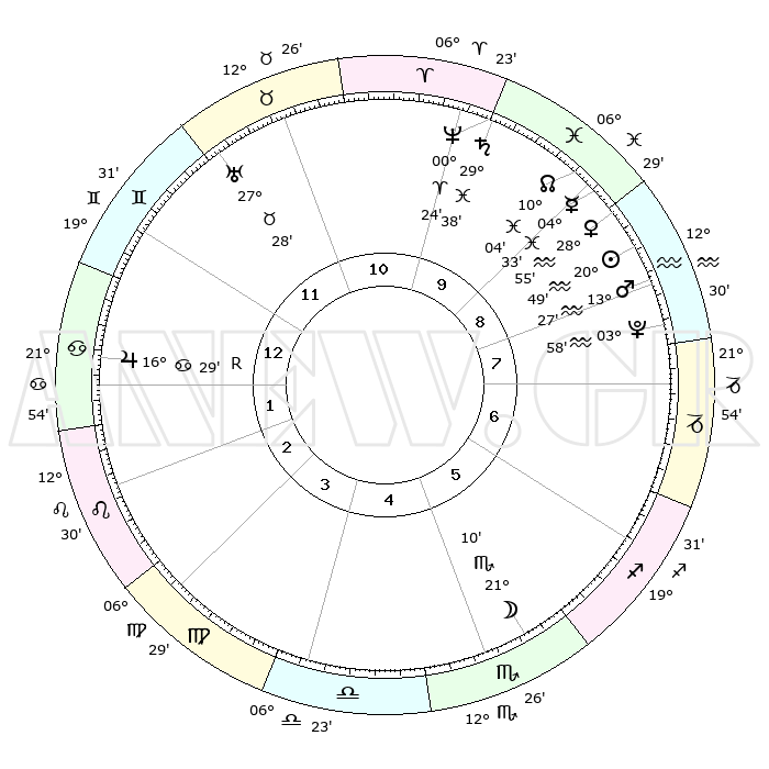 | | ΘΕΣΕΙΣ ΠΛΑΝΗΤΩΝ ΑΣΤΡΟΛΟΓΙΚΟΥ ΧΑΡΤΗ ΤΗΣ ΣΤΙΓΜΗΣ ΑΥΤΗΣ | | | | Πλανήτης | Ζώδιο | Μοίρες | Δεκαήμ. | Σε οίκο | Απόκλιση | | Ακμές των οίκων | | Ηλιος | Υδροχόος | 20°45' | Τρίτο | 9 | 14 S 34 | | 1ος | 04°20' | Καρκίνος | | Σελήνη | Σκορπιός | 20°29' | Τρίτο | 5 | 22 S 40 | | 2ος | 24°55' | Καρκίνος | | Ερμής | Ιχθείς | 04°27' | Πρώτο | 9 | 10 S 47 | | 3ος | 17°02' | Λέων | | Αφροδίτη | Υδροχόος | 28°51' | Τρίτο | 9 | 13 S 14 | | 4ος | 14°03' | Παρθένος | | Αρης | Υδροχόος | 13°24' | Δεύτερο | 8 | 17 S 49 | | 5ος | 18°38' | Ζυγός | | Δίας | Καρκίνος | 16°29'R | Δεύτερο | 1 | 22 N 44 | | 6ος | 28°16' | Σκορπιός | | Κρόνος | Ιχθείς | 29°38' | Τρίτο | 10 | 02 S 08 | | 7ος | 04°20' | Αιγόκερως | | Ουρανός | Ταύρος | 27°28' | Τρίτο | 11 | 19 N 25 | | 8ος | 24°55' | Αιγόκερως | | Ποσειδώνας | Κριός | 00°24' | Πρώτο | 10 | 01 S 03 | | 9ος | 17°02' | Υδροχόος | | Πλούτωνας | Υδροχόος | 03°58' | Πρώτο | 8 | 22 S 58 | | 10ος | 14°03' | Ιχθείς | | Β. Δεσμός | Ιχθείς | 10°05' | Δεύτερο | 9 | 07 S 47 | | 11ος | 18°38' | Κριός | | Ωροσκόπος | Καρκίνος | 04°20' | Πρώτο | | | 12ος | 28°16' | Ταύρος | | Μεσουράνημα | Ιχθείς | 14°03' | Δεύτερο | | | |