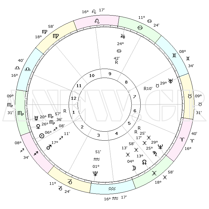 | | ΘΕΣΕΙΣ ΠΛΑΝΗΤΩΝ ΑΣΤΡΟΛΟΓΙΚΟΥ ΧΑΡΤΗ ΤΗΣ ΣΤΙΓΜΗΣ ΑΥΤΗΣ | | | | Πλανήτης | Ζώδιο | Μοίρες | Δεκαήμ. | Σε οίκο | Απόκλιση | | Ακμές των οίκων | | Ηλιος | Τοξότης | 06°05' | Πρώτο | 2 | 21 S 19 | | 1ος | 23°34' | Ζυγός | | Σελήνη | Ιχθείς | 03°30' | Πρώτο | 5 | 11 S 07 | | 2ος | 21°37' | Σκορπιός | | Ερμής | Σκορπιός | 20°58'R | Τρίτο | 1 | 15 S 40 | | 3ος | 23°07' | Τοξότης | | Αφροδίτη | Σκορπιός | 26°32' | Τρίτο | 2 | 18 S 35 | | 4ος | 26°54' | Αιγόκερως | | Αρης | Τοξότης | 17°09' | Δεύτερο | 2 | 23 S 27 | | 5ος | 29°51' | Υδροχόος | | Δίας | Καρκίνος | 24°42'R | Τρίτο | 9 | 21 N 20 | | 6ος | 29°03' | Ιχθείς | | Κρόνος | Ιχθείς | 25°17'R | Τρίτο | 5 | 04 S 04 | | 7ος | 23°34' | Κριός | | Ουρανός | Ταύρος | 29°10'R | Τρίτο | 8 | 19 N 46 | | 8ος | 21°37' | Ταύρος | | Ποσειδώνας | Ιχθείς | 29°25'R | Τρίτο | 6 | 01 S 29 | | 9ος | 23°07' | Δίδυμοι | | Πλούτωνας | Υδροχόος | 01°51' | Πρώτο | 4 | 23 S 25 | | 10ος | 26°54' | Καρκίνος | | Β. Δεσμός | Ιχθείς | 13°58' | Δεύτερο | 5 | 06 S 18 | | 11ος | 29°51' | Λέων | | Ωροσκόπος | Ζυγός | 23°34' | Τρίτο | | | 12ος | 29°03' | Παρθένος | | Μεσουράνημα | Καρκίνος | 26°54' | Τρίτο | | | |
