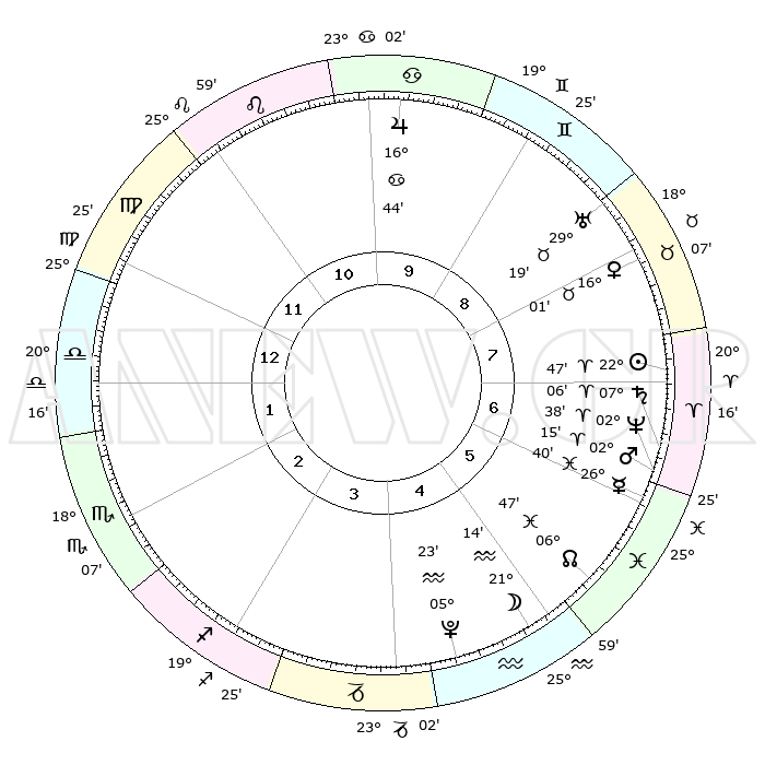 | | ΘΕΣΕΙΣ ΠΛΑΝΗΤΩΝ ΑΣΤΡΟΛΟΓΙΚΟΥ ΧΑΡΤΗ ΤΗΣ ΣΤΙΓΜΗΣ ΑΥΤΗΣ | | | | Πλανήτης | Ζώδιο | Μοίρες | Δεκαήμ. | Σε οίκο | Απόκλιση | | Ακμές των οίκων | | Ηλιος | Κριός | 22°44' | Τρίτο | 7 | 08 N 50 | | 1ος | 01°28' | Ζυγός | | Σελήνη | Υδροχόος | 20°25' | Τρίτο | 5 | 16 S 10 | | 2ος | 28°10' | Ζυγός | | Ερμής | Ιχθείς | 26°35' | Τρίτο | 6 | 03 S 39 | | 3ος | 28°39' | Σκορπιός | | Αφροδίτη | Ταύρος | 15°56' | Δεύτερο | 8 | 16 N 40 | | 4ος | 01°39' | Αιγόκερως | | Αρης | Κριός | 02°12' | Πρώτο | 7 | 00 S 02 | | 5ος | 04°37' | Υδροχόος | | Δίας | Καρκίνος | 16°44' | Δεύτερο | 10 | 22 N 46 | | 6ος | 04°59' | Ιχθείς | | Κρόνος | Κριός | 07°06' | Πρώτο | 7 | 00 N 51 | | 7ος | 01°28' | Κριός | | Ουρανός | Ταύρος | 29°18' | Τρίτο | 9 | 19 N 50 | | 8ος | 28°10' | Κριός | | Ποσειδώνας | Κριός | 02°38' | Πρώτο | 7 | 00 S 09 | | 9ος | 28°39' | Ταύρος | | Πλούτωνας | Υδροχόος | 05°23' | Πρώτο | 5 | 22 S 47 | | 10ος | 01°39' | Καρκίνος | | Β. Δεσμός | Ιχθείς | 06°47' | Πρώτο | 6 | 09 S 01 | | 11ος | 04°37' | Λέων | | Ωροσκόπος | Ζυγός | 01°28' | Πρώτο | | | 12ος | 04°59' | Παρθένος | | Μεσουράνημα | Καρκίνος | 01°39' | Πρώτο | | | |
