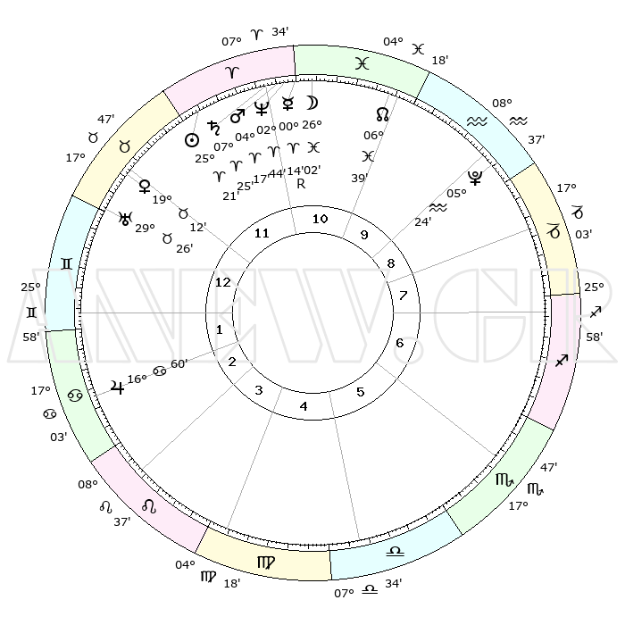 | | ΘΕΣΕΙΣ ΠΛΑΝΗΤΩΝ ΑΣΤΡΟΛΟΓΙΚΟΥ ΧΑΡΤΗ ΤΗΣ ΣΤΙΓΜΗΣ ΑΥΤΗΣ | | | | Πλανήτης | Ζώδιο | Μοίρες | Δεκαήμ. | Σε οίκο | Απόκλιση | | Ακμές των οίκων | | Ηλιος | Κριός | 25°17' | Τρίτο | 12 | 09 N 47 | | 1ος | 04°17' | Δίδυμοι | | Σελήνη | Ιχθείς | 25°13' | Τρίτο | 11 | 00 S 30 | | 2ος | 28°16' | Δίδυμοι | | Ερμής | Κριός | 00°09'R | Πρώτο | 11 | 02 S 19 | | 3ος | 19°33' | Καρκίνος | | Αφροδίτη | Ταύρος | 19°08' | Δεύτερο | 12 | 17 N 41 | | 4ος | 12°39' | Λέων | | Αρης | Κριός | 04°14' | Πρώτο | 11 | 00 N 47 | | 5ος | 11°53' | Παρθένος | | Δίας | Καρκίνος | 16°59' | Δεύτερο | 2 | 22 N 44 | | 6ος | 20°57' | Ζυγός | | Κρόνος | Κριός | 07°25' | Πρώτο | 11 | 00 N 58 | | 7ος | 04°17' | Τοξότης | | Ουρανός | Ταύρος | 29°26' | Τρίτο | 12 | 19 N 52 | | 8ος | 28°16' | Τοξότης | | Ποσειδώνας | Κριός | 02°44' | Πρώτο | 11 | 00 S 07 | | 9ος | 19°33' | Αιγόκερως | | Πλούτωνας | Υδροχόος | 05°24' | Πρώτο | 9 | 22 S 47 | | 10ος | 12°39' | Υδροχόος | | Β. Δεσμός | Ιχθείς | 06°39' | Πρώτο | 10 | 09 S 04 | | 11ος | 11°53' | Ιχθείς | | Ωροσκόπος | Δίδυμοι | 04°17' | Πρώτο | | | 12ος | 20°57' | Κριός | | Μεσουράνημα | Υδροχόος | 12°39' | Δεύτερο | | | |