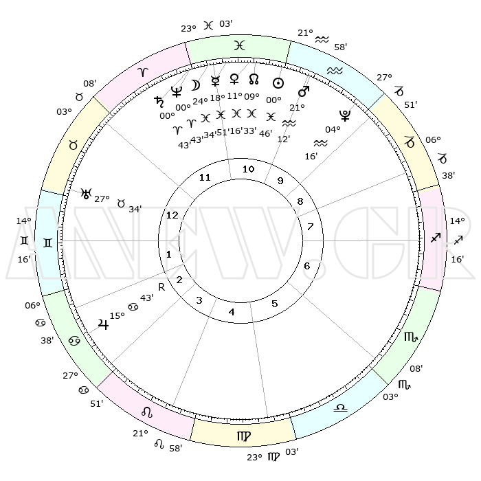 | | ΘΕΣΕΙΣ ΠΛΑΝΗΤΩΝ ΑΣΤΡΟΛΟΓΙΚΟΥ ΧΑΡΤΗ ΤΗΣ ΣΤΙΓΜΗΣ ΑΥΤΗΣ | | | | Πλανήτης | Ζώδιο | Μοίρες | Δεκαήμ. | Σε οίκο | Απόκλιση | | Ακμές των οίκων | | Ηλιος | Ιχθείς | 00°42' | Πρώτο | 11 | 11 S 13 | | 1ος | 15°01' | Ταύρος | | Σελήνη | Ιχθείς | 23°37' | Τρίτο | 11 | 01 S 18 | | 2ος | 13°15' | Δίδυμοι | | Ερμής | Ιχθείς | 18°47' | Δεύτερο | 11 | 03 S 26 | | 3ος | 05°29' | Καρκίνος | | Αφροδίτη | Ιχθείς | 11°11' | Δεύτερο | 11 | 08 S 43 | | 4ος | 27°27' | Καρκίνος | | Αρης | Υδροχόος | 21°09' | Τρίτο | 10 | 15 S 28 | | 5ος | 23°36' | Λέων | | Δίας | Καρκίνος | 15°43'R | Δεύτερο | 3 | 22 N 50 | | 6ος | 29°19' | Παρθένος | | Κρόνος | Κριός | 00°43' | Πρώτο | 12 | 01 S 41 | | 7ος | 15°01' | Σκορπιός | | Ουρανός | Ταύρος | 27°34' | Τρίτο | 1 | 19 N 26 | | 8ος | 13°15' | Τοξότης | | Ποσειδώνας | Κριός | 00°43' | Πρώτο | 12 | 00 S 55 | | 9ος | 05°29' | Αιγόκερως | | Πλούτωνας | Υδροχόος | 04°16' | Πρώτο | 10 | 22 S 55 | | 10ος | 27°27' | Αιγόκερως | | Β. Δεσμός | Ιχθείς | 09°33' | Πρώτο | 11 | 07 S 59 | | 11ος | 23°36' | Υδροχόος | | Ωροσκόπος | Ταύρος | 15°01' | Δεύτερο | | | 12ος | 29°19' | Ιχθείς | | Μεσουράνημα | Αιγόκερως | 27°27' | Τρίτο | | | |