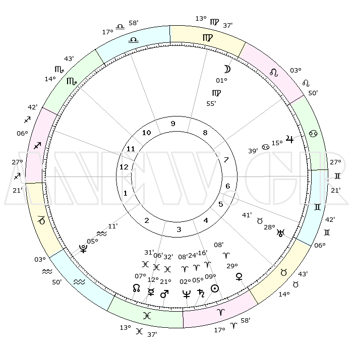 | | ΘΕΣΕΙΣ ΠΛΑΝΗΤΩΝ ΑΣΤΡΟΛΟΓΙΚΟΥ ΧΑΡΤΗ ΤΗΣ ΣΤΙΓΜΗΣ ΑΥΤΗΣ | | | | Πλανήτης | Ζώδιο | Μοίρες | Δεκαήμ. | Σε οίκο | Απόκλιση | | Ακμές των οίκων | | Ηλιος | Κριός | 09°11' | Πρώτο | 4 | 03 N 38 | | 1ος | 03°04' | Τοξότης | | Σελήνη | Παρθένος | 00°52' | Πρώτο | 9 | 11 N 50 | | 2ος | 04°38' | Αιγόκερως | | Ερμής | Ιχθείς | 12°02' | Δεύτερο | 3 | 07 S 56 | | 3ος | 10°51' | Υδροχόος | | Αφροδίτη | Κριός | 29°03' | Τρίτο | 5 | 10 N 38 | | 4ος | 16°57' | Ιχθείς | | Αρης | Ιχθείς | 21°28' | Τρίτο | 4 | 04 S 21 | | 5ος | 17°35' | Κριός | | Δίας | Καρκίνος | 15°39' | Δεύτερο | 8 | 22 N 53 | | 6ος | 12°13' | Ταύρος | | Κρόνος | Κριός | 05°24' | Πρώτο | 4 | 00 N 11 | | 7ος | 03°04' | Δίδυμοι | | Ουρανός | Ταύρος | 28°40' | Τρίτο | 6 | 19 N 41 | | 8ος | 04°38' | Καρκίνος | | Ποσειδώνας | Κριός | 02°08' | Πρώτο | 4 | 00 S 21 | | 9ος | 10°51' | Λέων | | Πλούτωνας | Υδροχόος | 05°11' | Πρώτο | 2 | 22 S 48 | | 10ος | 16°57' | Παρθένος | | Β. Δεσμός | Ιχθείς | 07°31' | Πρώτο | 3 | 08 S 45 | | 11ος | 17°35' | Ζυγός | | Ωροσκόπος | Τοξότης | 03°04' | Πρώτο | | | 12ος | 12°13' | Σκορπιός | | Μεσουράνημα | Παρθένος | 16°57' | Δεύτερο | | | |
