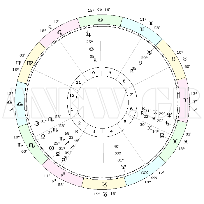 | | ΘΕΣΕΙΣ ΠΛΑΝΗΤΩΝ ΑΣΤΡΟΛΟΓΙΚΟΥ ΧΑΡΤΗ ΤΗΣ ΣΤΙΓΜΗΣ ΑΥΤΗΣ | | | | Πλανήτης | Ζώδιο | Μοίρες | Δεκαήμ. | Σε οίκο | Απόκλιση | | Ακμές των οίκων | | Ηλιος | Σκορπιός | 25°54' | Τρίτο | 3 | 19 S 14 | | 1ος | 24°54' | Παρθένος | | Σελήνη | Σκορπιός | 01°13' | Πρώτο | 2 | 15 S 15 | | 2ος | 21°06' | Ζυγός | | Ερμής | Τοξότης | 01°28'R | Πρώτο | 3 | 20 S 43 | | 3ος | 21°20' | Σκορπιός | | Αφροδίτη | Σκορπιός | 13°53' | Δεύτερο | 2 | 14 S 56 | | 4ος | 24°16' | Τοξότης | | Αρης | Τοξότης | 09°45' | Πρώτο | 3 | 22 S 27 | | 5ος | 27°20' | Αιγόκερως | | Δίας | Καρκίνος | 25°05'R | Τρίτο | 10 | 21 N 14 | | 6ος | 27°58' | Υδροχόος | | Κρόνος | Ιχθείς | 25°23'R | Τρίτο | 7 | 04 S 03 | | 7ος | 24°54' | Ιχθείς | | Ουρανός | Ταύρος | 29°35'R | Τρίτο | 9 | 19 N 51 | | 8ος | 21°06' | Κριός | | Ποσειδώνας | Ιχθείς | 29°31'R | Τρίτο | 7 | 01 S 27 | | 9ος | 21°20' | Ταύρος | | Πλούτωνας | Υδροχόος | 01°39' | Πρώτο | 5 | 23 S 27 | | 10ος | 24°16' | Δίδυμοι | | Β. Δεσμός | Ιχθείς | 14°30' | Δεύτερο | 6 | 06 S 06 | | 11ος | 27°20' | Καρκίνος | | Ωροσκόπος | Παρθένος | 24°54' | Τρίτο | | | 12ος | 27°58' | Λέων | | Μεσουράνημα | Δίδυμοι | 24°16' | Τρίτο | | | |