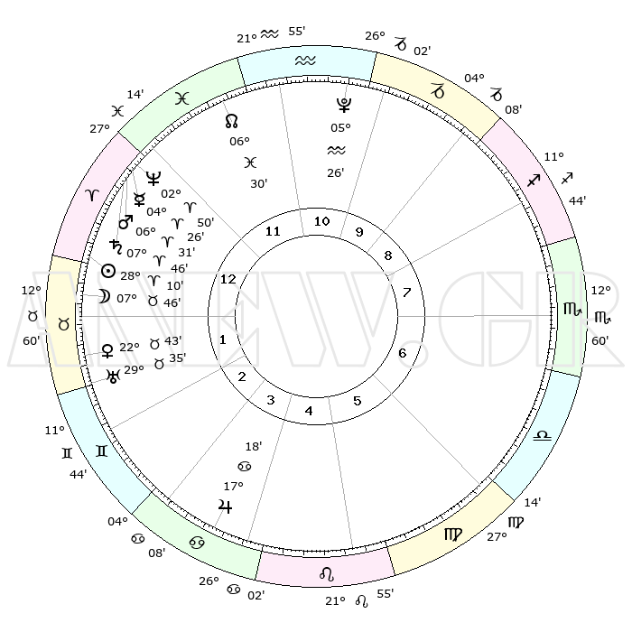 | | ΘΕΣΕΙΣ ΠΛΑΝΗΤΩΝ ΑΣΤΡΟΛΟΓΙΚΟΥ ΧΑΡΤΗ ΤΗΣ ΣΤΙΓΜΗΣ ΑΥΤΗΣ | | | | Πλανήτης | Ζώδιο | Μοίρες | Δεκαήμ. | Σε οίκο | Απόκλιση | | Ακμές των οίκων | | Ηλιος | Κριός | 28°07' | Τρίτο | 1 | 10 N 48 | | 1ος | 12°57' | Κριός | | Σελήνη | Ταύρος | 06°56' | Πρώτο | 1 | 17 N 58 | | 2ος | 19°54' | Ταύρος | | Ερμής | Κριός | 04°21' | Πρώτο | 12 | 00 S 41 | | 3ος | 15°27' | Δίδυμοι | | Αφροδίτη | Ταύρος | 22°39' | Τρίτο | 2 | 18 N 44 | | 4ος | 07°19' | Καρκίνος | | Αρης | Κριός | 06°28' | Πρώτο | 12 | 01 N 41 | | 5ος | 00°20' | Λέων | | Δίας | Καρκίνος | 17°18' | Δεύτερο | 4 | 22 N 42 | | 6ος | 29°51' | Λέων | | Κρόνος | Κριός | 07°46' | Πρώτο | 12 | 01 N 06 | | 7ος | 12°57' | Ζυγός | | Ουρανός | Ταύρος | 29°35' | Τρίτο | 2 | 19 N 54 | | 8ος | 19°54' | Σκορπιός | | Ποσειδώνας | Κριός | 02°50' | Πρώτο | 12 | 00 S 05 | | 9ος | 15°27' | Τοξότης | | Πλούτωνας | Υδροχόος | 05°26' | Πρώτο | 11 | 22 S 47 | | 10ος | 07°19' | Αιγόκερως | | Β. Δεσμός | Ιχθείς | 06°30' | Πρώτο | 12 | 09 S 08 | | 11ος | 00°20' | Υδροχόος | | Ωροσκόπος | Κριός | 12°57' | Δεύτερο | | | 12ος | 29°51' | Υδροχόος | | Μεσουράνημα | Αιγόκερως | 07°19' | Πρώτο | | | |