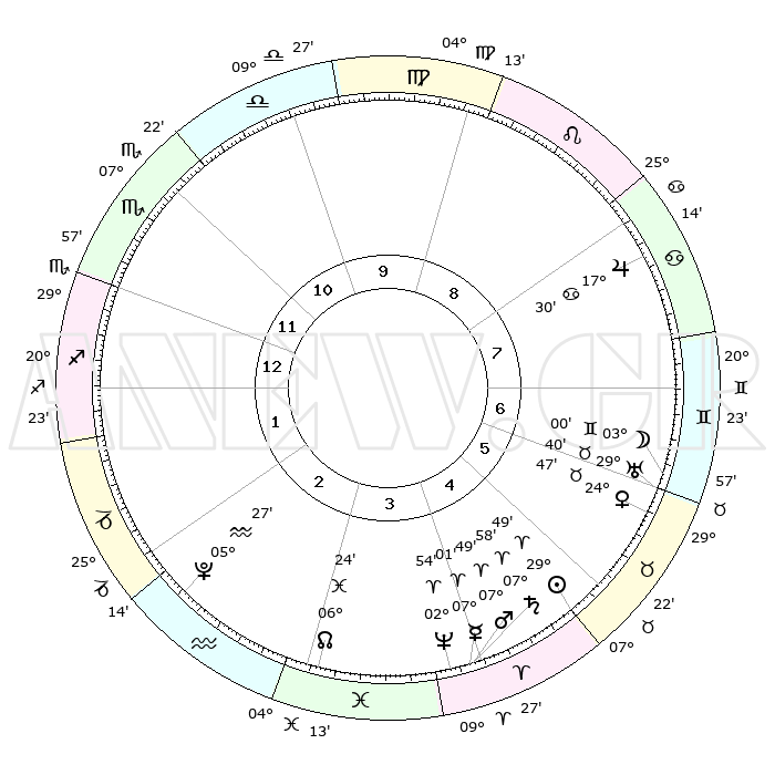 | | ΘΕΣΕΙΣ ΠΛΑΝΗΤΩΝ ΑΣΤΡΟΛΟΓΙΚΟΥ ΧΑΡΤΗ ΤΗΣ ΣΤΙΓΜΗΣ ΑΥΤΗΣ | | | | Πλανήτης | Ζώδιο | Μοίρες | Δεκαήμ. | Σε οίκο | Απόκλιση | | Ακμές των οίκων | | Ηλιος | Κριός | 29°46' | Τρίτο | 5 | 11 N 23 | | 1ος | 03°23' | Τοξότης | | Σελήνη | Δίδυμοι | 02°10' | Πρώτο | 6 | 25 N 34 | | 2ος | 05°00' | Αιγόκερως | | Ερμής | Κριός | 06°56' | Πρώτο | 4 | 00 N 20 | | 3ος | 11°17' | Υδροχόος | | Αφροδίτη | Ταύρος | 24°43' | Τρίτο | 6 | 19 N 20 | | 4ος | 17°22' | Ιχθείς | | Αρης | Κριός | 07°47' | Πρώτο | 4 | 02 N 12 | | 5ος | 17°58' | Κριός | | Δίας | Καρκίνος | 17°30' | Δεύτερο | 8 | 22 N 40 | | 6ος | 12°33' | Ταύρος | | Κρόνος | Κριός | 07°58' | Πρώτο | 4 | 01 N 11 | | 7ος | 03°23' | Δίδυμοι | | Ουρανός | Ταύρος | 29°40' | Τρίτο | 6 | 19 N 55 | | 8ος | 05°00' | Καρκίνος | | Ποσειδώνας | Κριός | 02°54' | Πρώτο | 4 | 00 S 03 | | 9ος | 11°17' | Λέων | | Πλούτωνας | Υδροχόος | 05°27' | Πρώτο | 2 | 22 S 48 | | 10ος | 17°22' | Παρθένος | | Β. Δεσμός | Ιχθείς | 06°24' | Πρώτο | 3 | 09 S 09 | | 11ος | 17°58' | Ζυγός | | Ωροσκόπος | Τοξότης | 03°23' | Πρώτο | | | 12ος | 12°33' | Σκορπιός | | Μεσουράνημα | Παρθένος | 17°22' | Δεύτερο | | | |