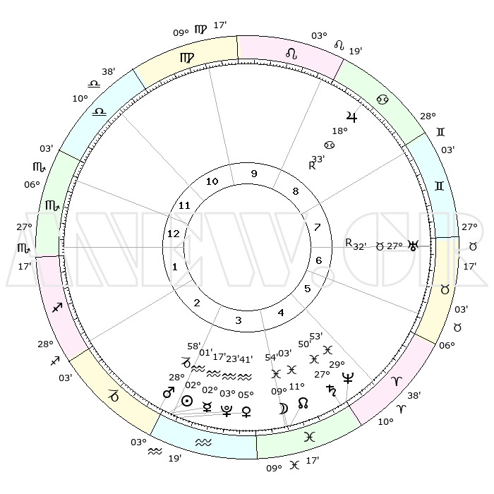 | | ΘΕΣΕΙΣ ΠΛΑΝΗΤΩΝ ΑΣΤΡΟΛΟΓΙΚΟΥ ΧΑΡΤΗ ΤΗΣ ΣΤΙΓΜΗΣ ΑΥΤΗΣ | | | | Πλανήτης | Ζώδιο | Μοίρες | Δεκαήμ. | Σε οίκο | Απόκλιση | | Ακμές των οίκων | | Ηλιος | Υδροχόος | 01°56' | Πρώτο | 3 | 19 S 43 | | 1ος | 04°57' | Σκορπιός | | Σελήνη | Ιχθείς | 08°54' | Πρώτο | 4 | 08 S 16 | | 2ος | 03°40' | Τοξότης | | Ερμής | Υδροχόος | 02°09' | Πρώτο | 3 | 21 S 41 | | 3ος | 06°03' | Αιγόκερως | | Αφροδίτη | Υδροχόος | 05°35' | Πρώτο | 3 | 20 S 00 | | 4ος | 10°35' | Υδροχόος | | Αρης | Αιγόκερως | 28°54' | Τρίτο | 3 | 21 S 21 | | 5ος | 13°25' | Ιχθείς | | Δίας | Καρκίνος | 18°34'R | Δεύτερο | 9 | 22 N 26 | | 6ος | 11°37' | Κριός | | Κρόνος | Ιχθείς | 27°49' | Τρίτο | 5 | 02 S 53 | | 7ος | 04°57' | Ταύρος | | Ουρανός | Ταύρος | 27°32'R | Τρίτο | 7 | 19 N 25 | | 8ος | 03°40' | Δίδυμοι | | Ποσειδώνας | Ιχθείς | 29°53' | Τρίτο | 5 | 01 S 15 | | 9ος | 06°03' | Καρκίνος | | Πλούτωνας | Υδροχόος | 03°23' | Πρώτο | 3 | 23 S 05 | | 10ος | 10°35' | Λέων | | Β. Δεσμός | Ιχθείς | 11°04' | Δεύτερο | 4 | 07 S 25 | | 11ος | 13°25' | Παρθένος | | Ωροσκόπος | Σκορπιός | 04°57' | Πρώτο | | | 12ος | 11°37' | Ζυγός | | Μεσουράνημα | Λέων | 10°35' | Δεύτερο | | | |