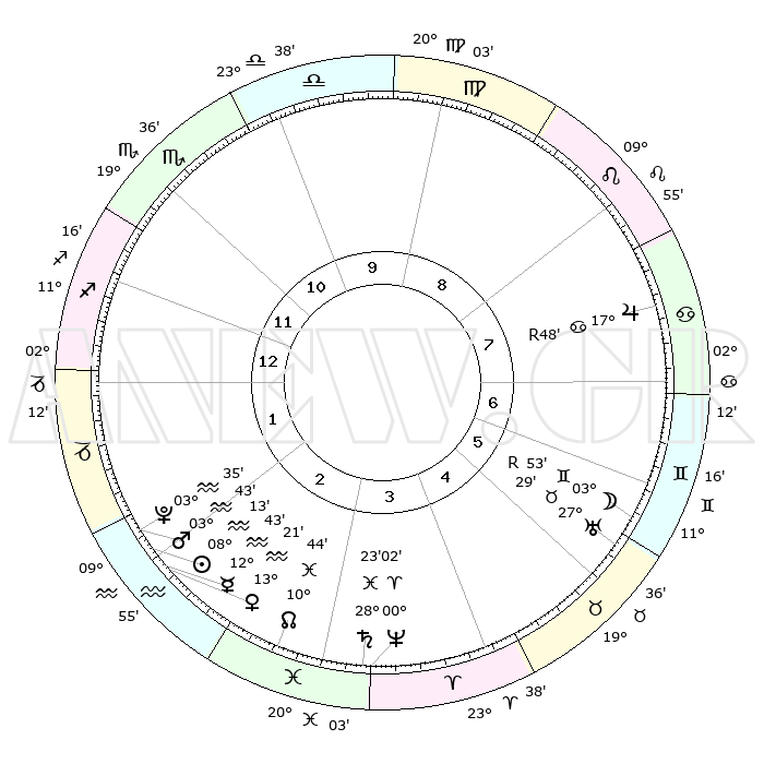 | | ΘΕΣΕΙΣ ΠΛΑΝΗΤΩΝ ΑΣΤΡΟΛΟΓΙΚΟΥ ΧΑΡΤΗ ΤΗΣ ΣΤΙΓΜΗΣ ΑΥΤΗΣ | | | | Πλανήτης | Ζώδιο | Μοίρες | Δεκαήμ. | Σε οίκο | Απόκλιση | | Ακμές των οίκων | | Ηλιος | Υδροχόος | 08°09' | Πρώτο | 2 | 18 S 13 | | 1ος | 14°43' | Τοξότης | | Σελήνη | Δίδυμοι | 03°06' | Πρώτο | 6 | 25 N 51 | | 2ος | 18°21' | Αιγόκερως | | Ερμής | Υδροχόος | 12°37' | Δεύτερο | 2 | 18 S 59 | | 3ος | 26°31' | Υδροχόος | | Αφροδίτη | Υδροχόος | 13°16' | Δεύτερο | 2 | 18 S 04 | | 4ος | 02°15' | Κριός | | Αρης | Υδροχόος | 03°41' | Πρώτο | 2 | 20 S 20 | | 5ος | 01°06' | Ταύρος | | Δίας | Καρκίνος | 17°48'R | Δεύτερο | 7 | 22 N 33 | | 6ος | 24°17' | Ταύρος | | Κρόνος | Ιχθείς | 28°23' | Τρίτο | 3 | 02 S 39 | | 7ος | 14°43' | Δίδυμοι | | Ουρανός | Ταύρος | 27°29'R | Τρίτο | 6 | 19 N 24 | | 8ος | 18°21' | Καρκίνος | | Ποσειδώνας | Κριός | 00°02' | Πρώτο | 3 | 01 S 12 | | 9ος | 26°31' | Λέων | | Πλούτωνας | Υδροχόος | 03°35' | Πρώτο | 2 | 23 S 03 | | 10ος | 02°15' | Ζυγός | | Β. Δεσμός | Ιχθείς | 10°44' | Δεύτερο | 3 | 07 S 32 | | 11ος | 01°06' | Σκορπιός | | Ωροσκόπος | Τοξότης | 14°43' | Δεύτερο | | | 12ος | 24°17' | Σκορπιός | | Μεσουράνημα | Ζυγός | 02°15' | Πρώτο | | | |