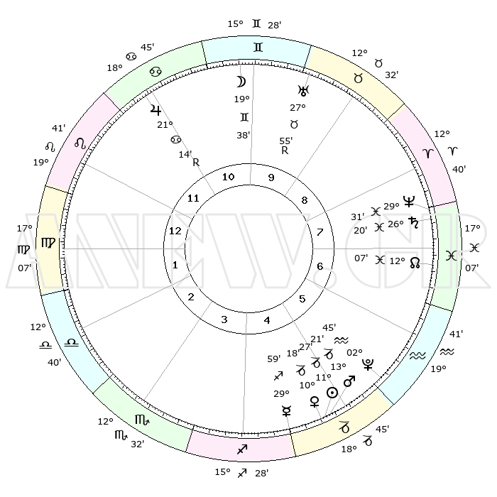 | | ΘΕΣΕΙΣ ΠΛΑΝΗΤΩΝ ΑΣΤΡΟΛΟΓΙΚΟΥ ΧΑΡΤΗ ΤΗΣ ΣΤΙΓΜΗΣ ΑΥΤΗΣ | | | | Πλανήτης | Ζώδιο | Μοίρες | Δεκαήμ. | Σε οίκο | Απόκλιση | | Ακμές των οίκων | | Ηλιος | Αιγόκερως | 11°23' | Δεύτερο | 5 | 22 S 57 | | 1ος | 27°01' | Λέων | | Σελήνη | Δίδυμοι | 18°36' | Δεύτερο | 10 | 27 N 57 | | 2ος | 20°33' | Παρθένος | | Ερμής | Τοξότης | 29°52' | Τρίτο | 5 | 24 S 05 | | 3ος | 18°57' | Ζυγός | | Αφροδίτη | Αιγόκερως | 10°13' | Δεύτερο | 5 | 23 S 34 | | 4ος | 21°49' | Σκορπιός | | Αρης | Αιγόκερως | 13°18' | Δεύτερο | 5 | 23 S 40 | | 5ος | 26°13' | Τοξότης | | Δίας | Καρκίνος | 21°15'R | Τρίτο | 11 | 22 N 00 | | 6ος | 28°25' | Αιγόκερως | | Κρόνος | Ιχθείς | 26°20' | Τρίτο | 8 | 03 S 32 | | 7ος | 27°01' | Υδροχόος | | Ουρανός | Ταύρος | 27°55'R | Τρίτο | 10 | 19 N 30 | | 8ος | 20°33' | Ιχθείς | | Ποσειδώνας | Ιχθείς | 29°31' | Τρίτο | 8 | 01 S 25 | | 9ος | 18°57' | Κριός | | Πλούτωνας | Υδροχόος | 02°45' | Πρώτο | 6 | 23 S 13 | | 10ος | 21°49' | Ταύρος | | Β. Δεσμός | Ιχθείς | 12°08' | Δεύτερο | 7 | 07 S 01 | | 11ος | 26°13' | Δίδυμοι | | Ωροσκόπος | Λέων | 27°01' | Τρίτο | | | 12ος | 28°25' | Καρκίνος | | Μεσουράνημα | Ταύρος | 21°49' | Τρίτο | | | |