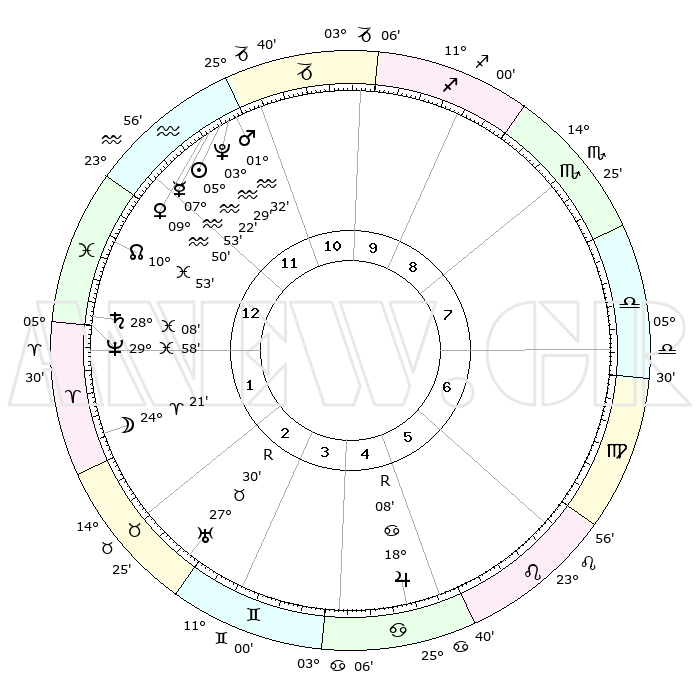 | | ΘΕΣΕΙΣ ΠΛΑΝΗΤΩΝ ΑΣΤΡΟΛΟΓΙΚΟΥ ΧΑΡΤΗ ΤΗΣ ΣΤΙΓΜΗΣ ΑΥΤΗΣ | | | | Πλανήτης | Ζώδιο | Μοίρες | Δεκαήμ. | Σε οίκο | Απόκλιση | | Ακμές των οίκων | | Ηλιος | Υδροχόος | 05°18' | Πρώτο | 12 | 18 S 56 | | 1ος | 27°45' | Υδροχόος | | Σελήνη | Κριός | 23°26' | Τρίτο | 2 | 12 N 28 | | 2ος | 13°20' | Κριός | | Ερμής | Υδροχόος | 07°47' | Πρώτο | 12 | 20 S 20 | | 3ος | 16°29' | Ταύρος | | Αφροδίτη | Υδροχόος | 09°45' | Πρώτο | 12 | 19 S 00 | | 4ος | 11°07' | Δίδυμοι | | Αρης | Υδροχόος | 01°29' | Πρώτο | 12 | 20 S 49 | | 5ος | 02°49' | Καρκίνος | | Δίας | Καρκίνος | 18°09'R | Δεύτερο | 5 | 22 N 30 | | 6ος | 26°09' | Καρκίνος | | Κρόνος | Ιχθείς | 28°07' | Τρίτο | 1 | 02 S 45 | | 7ος | 27°45' | Λέων | | Ουρανός | Ταύρος | 27°30'R | Τρίτο | 3 | 19 N 25 | | 8ος | 13°20' | Ζυγός | | Ποσειδώνας | Ιχθείς | 29°58' | Τρίτο | 1 | 01 S 13 | | 9ος | 16°29' | Σκορπιός | | Πλούτωνας | Υδροχόος | 03°29' | Πρώτο | 12 | 23 S 04 | | 10ος | 11°07' | Τοξότης | | Β. Δεσμός | Ιχθείς | 10°53' | Δεύτερο | 1 | 07 S 29 | | 11ος | 02°49' | Αιγόκερως | | Ωροσκόπος | Υδροχόος | 27°45' | Τρίτο | | | 12ος | 26°09' | Αιγόκερως | | Μεσουράνημα | Τοξότης | 11°07' | Δεύτερο | | | |