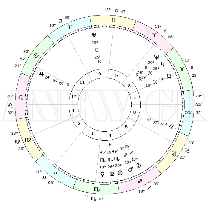 | | ΘΕΣΕΙΣ ΠΛΑΝΗΤΩΝ ΑΣΤΡΟΛΟΓΙΚΟΥ ΧΑΡΤΗ ΤΗΣ ΣΤΙΓΜΗΣ ΑΥΤΗΣ | | | | Πλανήτης | Ζώδιο | Μοίρες | Δεκαήμ. | Σε οίκο | Απόκλιση | | Ακμές των οίκων | | Ηλιος | Σκορπιός | 29°45' | Τρίτο | 4 | 20 S 06 | | 1ος | 05°27' | Λέων | | Σελήνη | Τοξότης | 16°32' | Δεύτερο | 5 | 27 S 44 | | 2ος | 26°53' | Λέων | | Ερμής | Σκορπιός | 26°23'R | Τρίτο | 4 | 18 S 21 | | 3ος | 22°40' | Παρθένος | | Αφροδίτη | Σκορπιός | 18°41' | Δεύτερο | 4 | 16 S 24 | | 4ος | 24°19' | Ζυγός | | Αρης | Τοξότης | 12°32' | Δεύτερο | 5 | 22 S 52 | | 5ος | 00°11' | Τοξότης | | Δίας | Καρκίνος | 24°59'R | Τρίτο | 12 | 21 N 16 | | 6ος | 05°00' | Αιγόκερως | | Κρόνος | Ιχθείς | 25°19'R | Τρίτο | 9 | 04 S 04 | | 7ος | 05°27' | Υδροχόος | | Ουρανός | Ταύρος | 29°26'R | Τρίτο | 10 | 19 N 49 | | 8ος | 26°53' | Υδροχόος | | Ποσειδώνας | Ιχθείς | 29°28'R | Τρίτο | 9 | 01 S 27 | | 9ος | 22°40' | Ιχθείς | | Πλούτωνας | Υδροχόος | 01°43' | Πρώτο | 6 | 23 S 27 | | 10ος | 24°19' | Κριός | | Β. Δεσμός | Ιχθείς | 14°18' | Δεύτερο | 8 | 06 S 11 | | 11ος | 00°11' | Δίδυμοι | | Ωροσκόπος | Λέων | 05°27' | Πρώτο | | | 12ος | 05°00' | Καρκίνος | | Μεσουράνημα | Κριός | 24°19' | Τρίτο | | | |