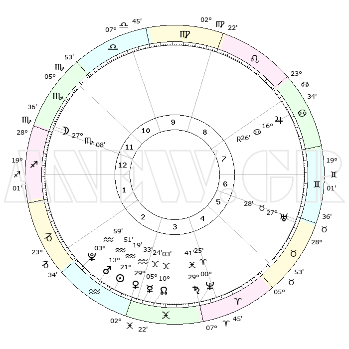 | | ΘΕΣΕΙΣ ΠΛΑΝΗΤΩΝ ΑΣΤΡΟΛΟΓΙΚΟΥ ΧΑΡΤΗ ΤΗΣ ΣΤΙΓΜΗΣ ΑΥΤΗΣ | | | | Πλανήτης | Ζώδιο | Μοίρες | Δεκαήμ. | Σε οίκο | Απόκλιση | | Ακμές των οίκων | | Ηλιος | Υδροχόος | 21°15' | Τρίτο | 3 | 14 S 25 | | 1ος | 01°05' | Τοξότης | | Σελήνη | Σκορπιός | 26°25' | Τρίτο | 12 | 24 S 20 | | 2ος | 02°22' | Αιγόκερως | | Ερμής | Ιχθείς | 05°18' | Πρώτο | 3 | 10 S 24 | | 3ος | 08°15' | Υδροχόος | | Αφροδίτη | Υδροχόος | 29°29' | Τρίτο | 3 | 13 S 01 | | 4ος | 14°19' | Ιχθείς | | Αρης | Υδροχόος | 13°48' | Δεύτερο | 3 | 17 S 42 | | 5ος | 15°13' | Κριός | | Δίας | Καρκίνος | 16°27'R | Δεύτερο | 8 | 22 N 44 | | 6ος | 10°07' | Ταύρος | | Κρόνος | Ιχθείς | 29°41' | Τρίτο | 4 | 02 S 06 | | 7ος | 01°05' | Δίδυμοι | | Ουρανός | Ταύρος | 27°28' | Τρίτο | 6 | 19 N 25 | | 8ος | 02°22' | Καρκίνος | | Ποσειδώνας | Κριός | 00°24' | Πρώτο | 4 | 01 S 02 | | 9ος | 08°15' | Λέων | | Πλούτωνας | Υδροχόος | 03°59' | Πρώτο | 2 | 22 S 58 | | 10ος | 14°19' | Παρθένος | | Β. Δεσμός | Ιχθείς | 10°03' | Δεύτερο | 3 | 07 S 48 | | 11ος | 15°13' | Ζυγός | | Ωροσκόπος | Τοξότης | 01°05' | Πρώτο | | | 12ος | 10°07' | Σκορπιός | | Μεσουράνημα | Παρθένος | 14°19' | Δεύτερο | | | |