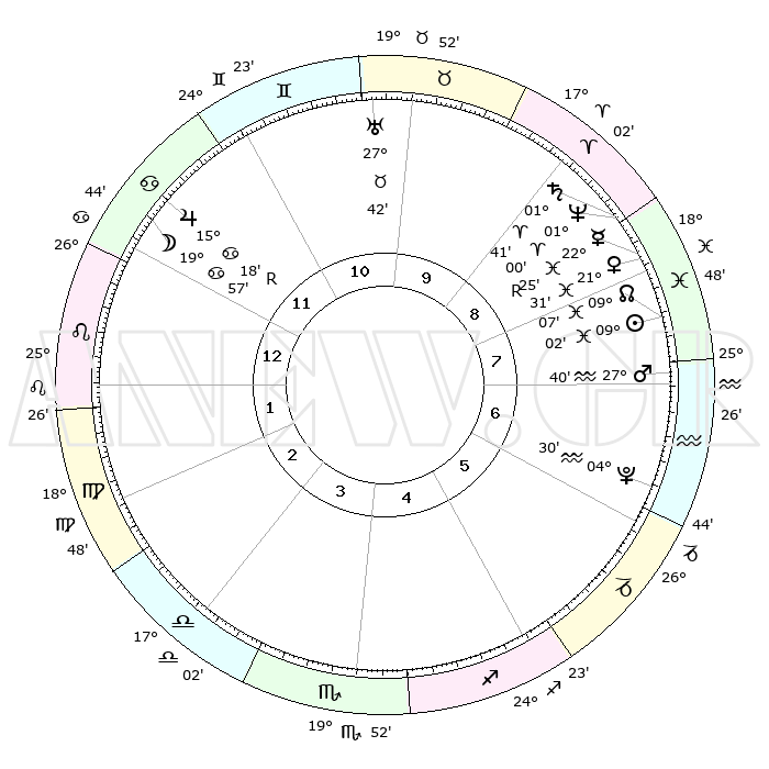 | | ΘΕΣΕΙΣ ΠΛΑΝΗΤΩΝ ΑΣΤΡΟΛΟΓΙΚΟΥ ΧΑΡΤΗ ΤΗΣ ΣΤΙΓΜΗΣ ΑΥΤΗΣ | | | | Πλανήτης | Ζώδιο | Μοίρες | Δεκαήμ. | Σε οίκο | Απόκλιση | | Ακμές των οίκων | | Ηλιος | Ιχθείς | 08°58' | Πρώτο | 8 | 08 S 12 | | 1ος | 06°19' | Λέων | | Σελήνη | Καρκίνος | 19°02' | Δεύτερο | 12 | 26 N 05 | | 2ος | 27°50' | Λέων | | Ερμής | Ιχθείς | 22°26'R | Τρίτο | 8 | 00 S 12 | | 3ος | 23°44' | Παρθένος | | Αφροδίτη | Ιχθείς | 21°26' | Τρίτο | 8 | 04 S 40 | | 4ος | 25°28' | Ζυγός | | Αρης | Υδροχόος | 27°37' | Τρίτο | 7 | 13 S 19 | | 5ος | 01°17' | Τοξότης | | Δίας | Καρκίνος | 15°18'R | Δεύτερο | 12 | 22 N 54 | | 6ος | 05°59' | Αιγόκερως | | Κρόνος | Κριός | 01°40' | Πρώτο | 9 | 01 S 18 | | 7ος | 06°19' | Υδροχόος | | Ουρανός | Ταύρος | 27°42' | Τρίτο | 10 | 19 N 28 | | 8ος | 27°50' | Υδροχόος | | Ποσειδώνας | Κριός | 00°60' | Πρώτο | 9 | 00 S 48 | | 9ος | 23°44' | Ιχθείς | | Πλούτωνας | Υδροχόος | 04°30' | Πρώτο | 6 | 22 S 53 | | 10ος | 25°28' | Κριός | | Β. Δεσμός | Ιχθείς | 09°07' | Πρώτο | 8 | 08 S 09 | | 11ος | 01°17' | Δίδυμοι | | Ωροσκόπος | Λέων | 06°19' | Πρώτο | | | 12ος | 05°59' | Καρκίνος | | Μεσουράνημα | Κριός | 25°28' | Τρίτο | | | |