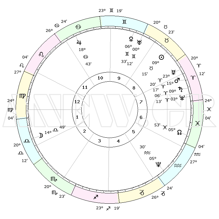 | | ΘΕΣΕΙΣ ΠΛΑΝΗΤΩΝ ΑΣΤΡΟΛΟΓΙΚΟΥ ΧΑΡΤΗ ΤΗΣ ΣΤΙΓΜΗΣ ΑΥΤΗΣ | | | | Πλανήτης | Ζώδιο | Μοίρες | Δεκαήμ. | Σε οίκο | Απόκλιση | | Ακμές των οίκων | | Ηλιος | Ταύρος | 09°12' | Πρώτο | 9 | 14 N 33 | | 1ος | 08°08' | Παρθένος | | Σελήνη | Ζυγός | 14°08' | Δεύτερο | 2 | 08 S 23 | | 2ος | 02°50' | Ζυγός | | Ερμής | Κριός | 23°14' | Τρίτο | 8 | 07 N 06 | | 3ος | 02°09' | Σκορπιός | | Αφροδίτη | Δίδυμοι | 06°29' | Πρώτο | 10 | 22 N 12 | | 4ος | 05°07' | Τοξότης | | Αρης | Κριός | 15°14' | Δεύτερο | 8 | 05 N 10 | | 5ος | 08°48' | Αιγόκερως | | Δίας | Καρκίνος | 18°43' | Δεύτερο | 11 | 22 N 31 | | 6ος | 10°12' | Υδροχόος | | Κρόνος | Κριός | 09°06' | Πρώτο | 8 | 01 N 36 | | 7ος | 08°08' | Ιχθείς | | Ουρανός | Δίδυμοι | 00°12' | Πρώτο | 9 | 20 N 01 | | 8ος | 02°50' | Κριός | | Ποσειδώνας | Κριός | 03°13' | Πρώτο | 8 | 00 N 04 | | 9ος | 02°09' | Ταύρος | | Πλούτωνας | Υδροχόος | 05°30' | Πρώτο | 5 | 22 S 49 | | 10ος | 05°07' | Δίδυμοι | | Β. Δεσμός | Ιχθείς | 05°54' | Πρώτο | 6 | 09 S 21 | | 11ος | 08°48' | Καρκίνος | | Ωροσκόπος | Παρθένος | 08°08' | Πρώτο | | | 12ος | 10°12' | Λέων | | Μεσουράνημα | Δίδυμοι | 05°07' | Πρώτο | | | |