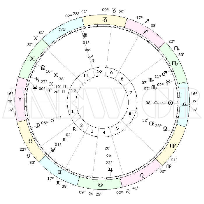 | ΘΕΣΕΙΣ ΠΛΑΝΗΤΩΝ ΑΣΤΡΟΛΟΓΙΚΟΥ ΧΑΡΤΗ ΤΗΣ ΣΤΙΓΜΗΣ ΑΥΤΗΣ | | Πλανήτης | Ζώδιο | Μοίρες | Δεκαήμ. | Σε οίκο | Απόκλιση | | Ακμές των οίκων | Ηλιος | Ζυγός | 15°32' | Δεύτερο | 8 | 06 S 07 | | 1ος | 26°26' | Υδροχόος | Σελήνη | Ταύρος | 05°22' | Πρώτο | 2 | 16 N 55 | | 2ος | 12°05' | Κριός | Ερμής | Σκορπιός | 02°49' | Πρώτο | 8 | 13 S 24 | | 3ος | 15°31' | Ταύρος | Αφροδίτη | Παρθένος | 23°26' | Τρίτο | 7 | 03 N 56 | | 4ος | 10°17' | Δίδυμοι | Αρης | Σκορπιός | 11°04' | Δεύτερο | 8 | 15 S 18 | | 5ος | 01°59' | Καρκίνος | Δίας | Καρκίνος | 23°19' | Τρίτο | 5 | 21 N 27 | | 6ος | 25°12' | Καρκίνος | Κρόνος | Ιχθείς | 27°20'R | Τρίτο | 1 | 03 S 22 | | 7ος | 26°26' | Λέων | Ουρανός | Δίδυμοι | 01°02'R | Πρώτο | 3 | 20 N 09 | | 8ος | 12°05' | Ζυγός | Ποσειδώνας | Κριός | 00°21'R | Πρώτο | 1 | 01 S 08 | | 9ος | 15°31' | Σκορπιός | Πλούτωνας | Υδροχόος | 01°22'R | Πρώτο | 12 | 23 S 32 | | 10ος | 10°17' | Τοξότης | Β. Δεσμός | Ιχθείς | 16°38' | Δεύτερο | 1 | 05 S 16 | | 11ος | 01°59' | Αιγόκερως | Ωροσκόπος | Υδροχόος | 26°26' | Τρίτο | | | 12ος | 25°12' | Αιγόκερως | Μεσουράνημα | Τοξότης | 10°17' | Δεύτερο | | | |