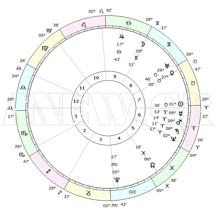 | | ΘΕΣΕΙΣ ΠΛΑΝΗΤΩΝ ΑΣΤΡΟΛΟΓΙΚΟΥ ΧΑΡΤΗ ΤΗΣ ΣΤΙΓΜΗΣ ΑΥΤΗΣ | | | | Πλανήτης | Ζώδιο | Μοίρες | Δεκαήμ. | Σε οίκο | Απόκλιση | | Ακμές των οίκων | | Ηλιος | Ταύρος | 01°32' | Πρώτο | 7 | 12 N 00 | | 1ος | 11°22' | Ζυγός | | Σελήνη | Δίδυμοι | 28°60' | Τρίτο | 9 | 28 N 10 | | 2ος | 08°42' | Σκορπιός | | Ερμής | Κριός | 09°47' | Πρώτο | 6 | 01 N 30 | | 3ος | 09°35' | Τοξότης | | Αφροδίτη | Ταύρος | 26°56' | Τρίτο | 8 | 19 N 56 | | 4ος | 12°49' | Αιγόκερως | | Αρης | Κριός | 09°11' | Πρώτο | 6 | 02 N 46 | | 5ος | 15°45' | Υδροχόος | | Δίας | Καρκίνος | 17°42' | Δεύτερο | 10 | 22 N 39 | | 6ος | 15°42' | Ιχθείς | | Κρόνος | Κριός | 08°11' | Πρώτο | 6 | 01 N 16 | | 7ος | 11°22' | Κριός | | Ουρανός | Ταύρος | 29°46' | Τρίτο | 8 | 19 N 56 | | 8ος | 08°42' | Ταύρος | | Ποσειδώνας | Κριός | 02°57' | Πρώτο | 6 | 00 S 02 | | 9ος | 09°35' | Δίδυμοι | | Πλούτωνας | Υδροχόος | 05°27' | Πρώτο | 4 | 22 S 48 | | 10ος | 12°49' | Καρκίνος | | Β. Δεσμός | Ιχθείς | 06°19' | Πρώτο | 5 | 09 S 12 | | 11ος | 15°45' | Λέων | | Ωροσκόπος | Ζυγός | 11°22' | Δεύτερο | | | 12ος | 15°42' | Παρθένος | | Μεσουράνημα | Καρκίνος | 12°49' | Δεύτερο | | | |
