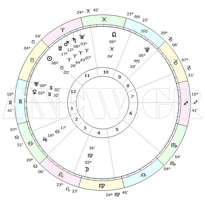 | | ΘΕΣΕΙΣ ΠΛΑΝΗΤΩΝ ΑΣΤΡΟΛΟΓΙΚΟΥ ΧΑΡΤΗ ΤΗΣ ΣΤΙΓΜΗΣ ΑΥΤΗΣ | | | | Πλανήτης | Ζώδιο | Μοίρες | Δεκαήμ. | Σε οίκο | Απόκλιση | | Ακμές των οίκων | | Ηλιος | Ταύρος | 05°58' | Πρώτο | 12 | 13 N 31 | | 1ος | 22°59' | Ταύρος | | Σελήνη | Παρθένος | 01°53' | Πρώτο | 5 | 11 N 15 | | 2ος | 19°18' | Δίδυμοι | | Ερμής | Κριός | 17°20' | Δεύτερο | 12 | 04 N 38 | | 3ος | 11°02' | Καρκίνος | | Αφροδίτη | Δίδυμοι | 02°28' | Πρώτο | 1 | 21 N 19 | | 4ος | 03°21' | Λέων | | Αρης | Κριός | 12°41' | Δεύτερο | 12 | 04 N 10 | | 5ος | 00°40' | Παρθένος | | Δίας | Καρκίνος | 18°16' | Δεύτερο | 3 | 22 N 34 | | 6ος | 07°55' | Ζυγός | | Κρόνος | Κριός | 08°43' | Πρώτο | 12 | 01 N 28 | | 7ος | 22°59' | Σκορπιός | | Ουρανός | Δίδυμοι | 00°01' | Πρώτο | 1 | 19 N 59 | | 8ος | 19°18' | Τοξότης | | Ποσειδώνας | Κριός | 03°06' | Πρώτο | 11 | 00 N 02 | | 9ος | 11°02' | Αιγόκερως | | Πλούτωνας | Υδροχόος | 05°29' | Πρώτο | 10 | 22 S 48 | | 10ος | 03°21' | Υδροχόος | | Β. Δεσμός | Ιχθείς | 06°04' | Πρώτο | 11 | 09 S 17 | | 11ος | 00°40' | Ιχθείς | | Ωροσκόπος | Ταύρος | 22°59' | Τρίτο | | | 12ος | 07°55' | Κριός | | Μεσουράνημα | Υδροχόος | 03°21' | Πρώτο | | | |