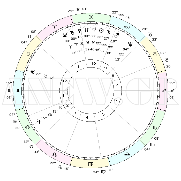 | | ΘΕΣΕΙΣ ΠΛΑΝΗΤΩΝ ΑΣΤΡΟΛΟΓΙΚΟΥ ΧΑΡΤΗ ΤΗΣ ΣΤΙΓΜΗΣ ΑΥΤΗΣ | | | | Πλανήτης | Ζώδιο | Μοίρες | Δεκαήμ. | Σε οίκο | Απόκλιση | | Ακμές των οίκων | | Ηλιος | Υδροχόος | 28°41' | Τρίτο | 11 | 11 S 56 | | 1ος | 13°43' | Ταύρος | | Σελήνη | Υδροχόος | 26°54' | Τρίτο | 11 | 13 S 35 | | 2ος | 12°16' | Δίδυμοι | | Ερμής | Ιχθείς | 16°29' | Δεύτερο | 11 | 04 S 47 | | 3ος | 04°36' | Καρκίνος | | Αφροδίτη | Ιχθείς | 08°41' | Πρώτο | 11 | 09 S 40 | | 4ος | 26°32' | Καρκίνος | | Αρης | Υδροχόος | 19°35' | Δεύτερο | 10 | 15 S 58 | | 5ος | 22°30' | Λέων | | Δίας | Καρκίνος | 15°51'R | Δεύτερο | 3 | 22 N 49 | | 6ος | 27°58' | Παρθένος | | Κρόνος | Κριός | 00°29' | Πρώτο | 12 | 01 S 46 | | 7ος | 13°43' | Σκορπιός | | Ουρανός | Ταύρος | 27°32' | Τρίτο | 1 | 19 N 26 | | 8ος | 12°16' | Τοξότης | | Ποσειδώνας | Κριός | 00°39' | Πρώτο | 12 | 00 S 57 | | 9ος | 04°36' | Αιγόκερως | | Πλούτωνας | Υδροχόος | 04°12' | Πρώτο | 10 | 22 S 56 | | 10ος | 26°31' | Αιγόκερως | | Β. Δεσμός | Ιχθείς | 09°40' | Πρώτο | 11 | 07 S 57 | | 11ος | 22°30' | Υδροχόος | | Ωροσκόπος | Ταύρος | 13°43' | Δεύτερο | | | 12ος | 27°58' | Ιχθείς | | Μεσουράνημα | Αιγόκερως | 26°31' | Τρίτο | | | |