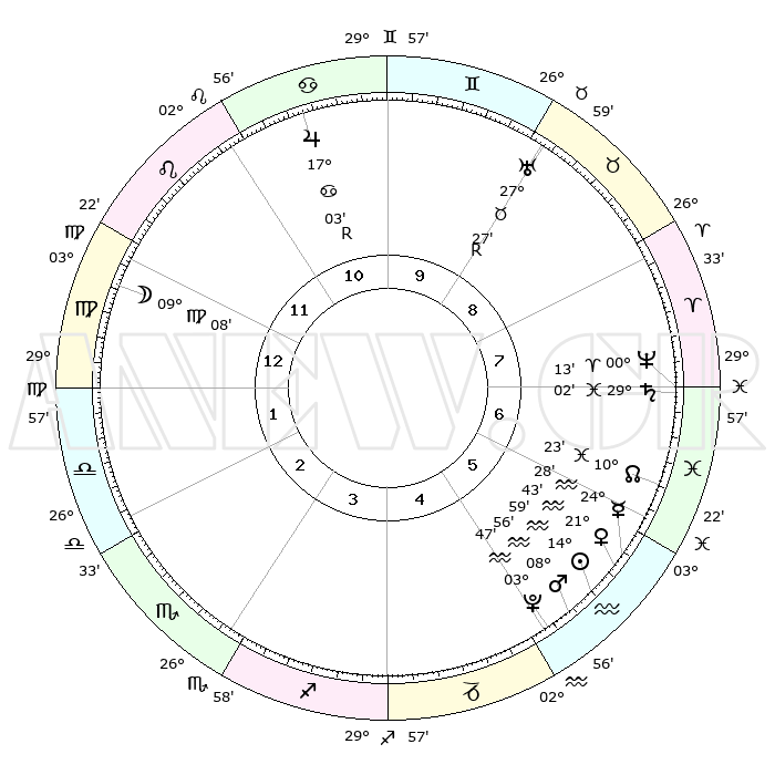 | | ΘΕΣΕΙΣ ΠΛΑΝΗΤΩΝ ΑΣΤΡΟΛΟΓΙΚΟΥ ΧΑΡΤΗ ΤΗΣ ΣΤΙΓΜΗΣ ΑΥΤΗΣ | | | | Πλανήτης | Ζώδιο | Μοίρες | Δεκαήμ. | Σε οίκο | Απόκλιση | | Ακμές των οίκων | | Ηλιος | Υδροχόος | 14°55' | Δεύτερο | 6 | 16 S 21 | | 1ος | 10°32' | Παρθένος | | Σελήνη | Παρθένος | 08°15' | Πρώτο | 12 | 08 N 33 | | 2ος | 05°28' | Ζυγός | | Ερμής | Υδροχόος | 24°21' | Τρίτο | 6 | 14 S 59 | | 3ος | 04°57' | Σκορπιός | | Αφροδίτη | Υδροχόος | 21°38' | Τρίτο | 6 | 15 S 37 | | 4ος | 07°54' | Τοξότης | | Αρης | Υδροχόος | 08°53' | Πρώτο | 5 | 19 S 03 | | 5ος | 11°28' | Αιγόκερως | | Δίας | Καρκίνος | 17°03'R | Δεύτερο | 11 | 22 N 39 | | 6ος | 12°44' | Υδροχόος | | Κρόνος | Ιχθείς | 29°02' | Τρίτο | 7 | 02 S 23 | | 7ος | 10°32' | Ιχθείς | | Ουρανός | Ταύρος | 27°27'R | Τρίτο | 9 | 19 N 24 | | 8ος | 05°28' | Κριός | | Ποσειδώνας | Κριός | 00°13' | Πρώτο | 7 | 01 S 07 | | 9ος | 04°57' | Ταύρος | | Πλούτωνας | Υδροχόος | 03°47' | Πρώτο | 5 | 23 S 00 | | 10ος | 07°54' | Δίδυμοι | | Β. Δεσμός | Ιχθείς | 10°23' | Δεύτερο | 6 | 07 S 40 | | 11ος | 11°28' | Καρκίνος | | Ωροσκόπος | Παρθένος | 10°32' | Δεύτερο | | | 12ος | 12°44' | Λέων | | Μεσουράνημα | Δίδυμοι | 07°54' | Πρώτο | | | |