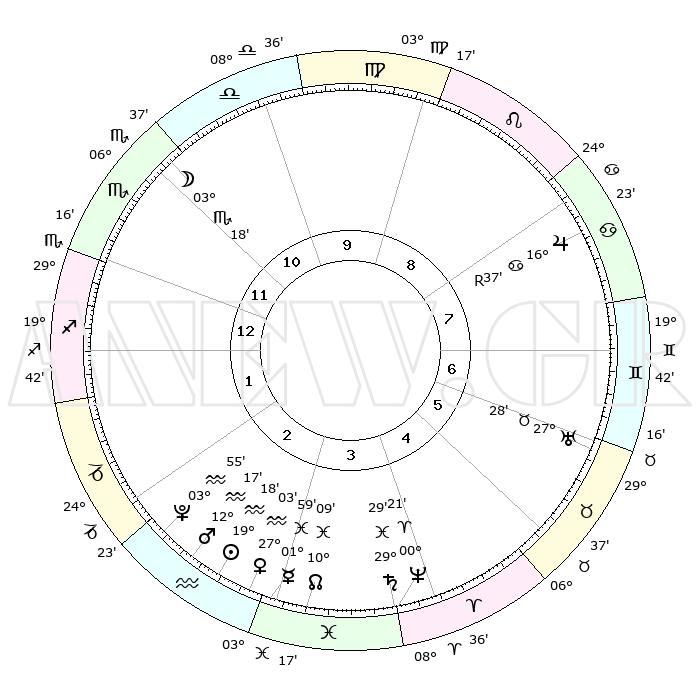 | | ΘΕΣΕΙΣ ΠΛΑΝΗΤΩΝ ΑΣΤΡΟΛΟΓΙΚΟΥ ΧΑΡΤΗ ΤΗΣ ΣΤΙΓΜΗΣ ΑΥΤΗΣ | | | | Πλανήτης | Ζώδιο | Μοίρες | Δεκαήμ. | Σε οίκο | Απόκλιση | | Ακμές των οίκων | | Ηλιος | Υδροχόος | 19°14' | Δεύτερο | 3 | 15 S 03 | | 1ος | 00°54' | Τοξότης | | Σελήνη | Σκορπιός | 02°33' | Πρώτο | 11 | 16 S 19 | | 2ος | 02°10' | Αιγόκερως | | Ερμής | Ιχθείς | 01°52' | Πρώτο | 3 | 11 S 56 | | 3ος | 08°01' | Υδροχόος | | Αφροδίτη | Υδροχόος | 26°59' | Τρίτο | 3 | 13 S 52 | | 4ος | 14°05' | Ιχθείς | | Αρης | Υδροχόος | 12°14' | Δεύτερο | 3 | 18 S 09 | | 5ος | 15°00' | Κριός | | Δίας | Καρκίνος | 16°38'R | Δεύτερο | 8 | 22 N 43 | | 6ος | 09°56' | Ταύρος | | Κρόνος | Ιχθείς | 29°28' | Τρίτο | 4 | 02 S 12 | | 7ος | 00°54' | Δίδυμοι | | Ουρανός | Ταύρος | 27°28' | Τρίτο | 6 | 19 N 24 | | 8ος | 02°10' | Καρκίνος | | Ποσειδώνας | Κριός | 00°21' | Πρώτο | 4 | 01 S 04 | | 9ος | 08°01' | Λέων | | Πλούτωνας | Υδροχόος | 03°55' | Πρώτο | 2 | 22 S 59 | | 10ος | 14°05' | Παρθένος | | Β. Δεσμός | Ιχθείς | 10°09' | Δεύτερο | 3 | 07 S 45 | | 11ος | 15°00' | Ζυγός | | Ωροσκόπος | Τοξότης | 00°54' | Πρώτο | | | 12ος | 09°56' | Σκορπιός | | Μεσουράνημα | Παρθένος | 14°05' | Δεύτερο | | | |