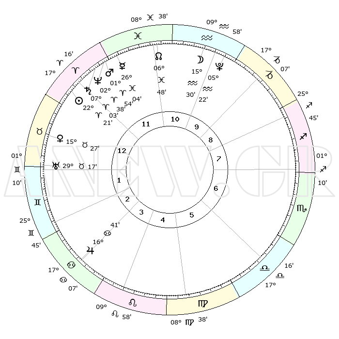 | | ΘΕΣΕΙΣ ΠΛΑΝΗΤΩΝ ΑΣΤΡΟΛΟΓΙΚΟΥ ΧΑΡΤΗ ΤΗΣ ΣΤΙΓΜΗΣ ΑΥΤΗΣ | | | | Πλανήτης | Ζώδιο | Μοίρες | Δεκαήμ. | Σε οίκο | Απόκλιση | | Ακμές των οίκων | | Ηλιος | Κριός | 22°17' | Τρίτο | 12 | 08 N 40 | | 1ος | 24°57' | Κριός | | Σελήνη | Υδροχόος | 14°34' | Δεύτερο | 11 | 18 S 26 | | 2ος | 28°34' | Ταύρος | | Ερμής | Ιχθείς | 25°58' | Τρίτο | 12 | 03 S 52 | | 3ος | 22°40' | Δίδυμοι | | Αφροδίτη | Ταύρος | 15°22' | Δεύτερο | 1 | 16 N 29 | | 4ος | 14°22' | Καρκίνος | | Αρης | Κριός | 01°51' | Πρώτο | 12 | 00 S 11 | | 5ος | 08°17' | Λέων | | Δίας | Καρκίνος | 16°41' | Δεύτερο | 4 | 22 N 46 | | 6ος | 10°01' | Παρθένος | | Κρόνος | Κριός | 07°02' | Πρώτο | 12 | 00 N 50 | | 7ος | 24°57' | Ζυγός | | Ουρανός | Ταύρος | 29°17' | Τρίτο | 2 | 19 N 50 | | 8ος | 28°34' | Σκορπιός | | Ποσειδώνας | Κριός | 02°37' | Πρώτο | 12 | 00 S 10 | | 9ος | 22°40' | Τοξότης | | Πλούτωνας | Υδροχόος | 05°22' | Πρώτο | 10 | 22 S 47 | | 10ος | 14°22' | Αιγόκερως | | Β. Δεσμός | Ιχθείς | 06°49' | Πρώτο | 11 | 09 S 01 | | 11ος | 08°17' | Υδροχόος | | Ωροσκόπος | Κριός | 24°57' | Τρίτο | | | 12ος | 10°01' | Ιχθείς | | Μεσουράνημα | Αιγόκερως | 14°22' | Δεύτερο | | | |