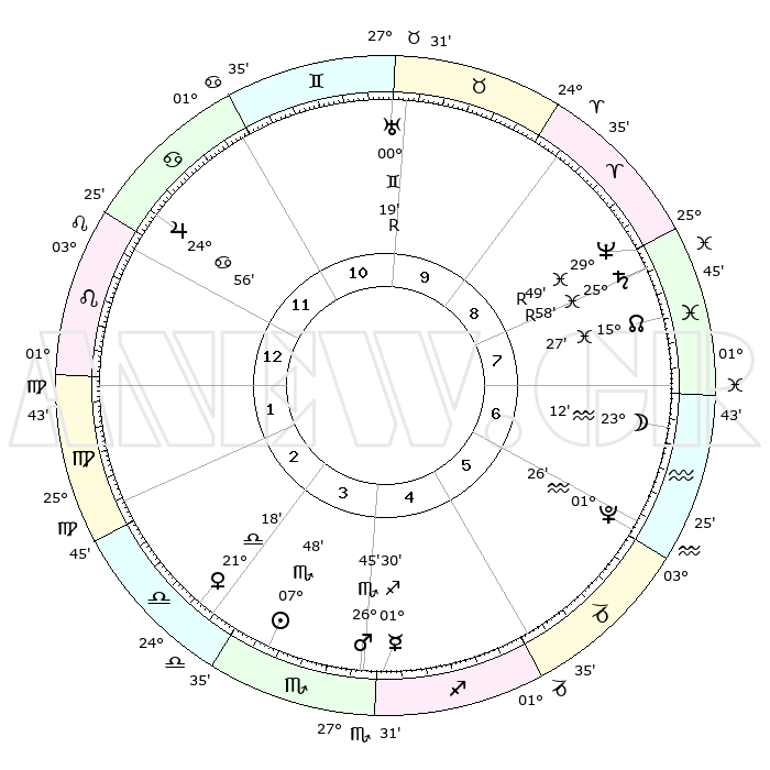 | | ΘΕΣΕΙΣ ΠΛΑΝΗΤΩΝ ΑΣΤΡΟΛΟΓΙΚΟΥ ΧΑΡΤΗ ΤΗΣ ΣΤΙΓΜΗΣ ΑΥΤΗΣ | | | | Πλανήτης | Ζώδιο | Μοίρες | Δεκαήμ. | Σε οίκο | Απόκλιση | | Ακμές των οίκων | | Ηλιος | Σκορπιός | 07°38' | Πρώτο | 5 | 14 S 03 | | 1ος | 11°47' | Καρκίνος | | Σελήνη | Υδροχόος | 20°58' | Τρίτο | 8 | 16 S 39 | | 2ος | 02°12' | Λέων | | Ερμής | Τοξότης | 01°20' | Πρώτο | 5 | 23 S 15 | | 3ος | 25°00' | Λέων | | Αφροδίτη | Ζυγός | 21°05' | Τρίτο | 4 | 06 S 51 | | 4ος | 23°16' | Παρθένος | | Αρης | Σκορπιός | 26°38' | Τρίτο | 5 | 19 S 46 | | 5ος | 28°43' | Ζυγός | | Δίας | Καρκίνος | 24°55' | Τρίτο | 1 | 21 N 13 | | 6ος | 07°25' | Τοξότης | | Κρόνος | Ιχθείς | 25°59'R | Τρίτο | 10 | 03 S 52 | | 7ος | 11°47' | Αιγόκερως | | Ουρανός | Δίδυμοι | 00°19'R | Πρώτο | 11 | 20 N 00 | | 8ος | 02°12' | Υδροχόος | | Ποσειδώνας | Ιχθείς | 29°49'R | Τρίτο | 10 | 01 S 20 | | 9ος | 25°00' | Υδροχόος | | Πλούτωνας | Υδροχόος | 01°26' | Πρώτο | 7 | 23 S 31 | | 10ος | 23°16' | Ιχθείς | | Β. Δεσμός | Ιχθείς | 15°28' | Δεύτερο | 9 | 05 S 44 | | 11ος | 28°44' | Κριός | | Ωροσκόπος | Καρκίνος | 11°47' | Δεύτερο | | | 12ος | 07°25' | Δίδυμοι | | Μεσουράνημα | Ιχθείς | 23°16' | Τρίτο | | | |