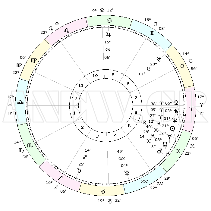 | | ΘΕΣΕΙΣ ΠΛΑΝΗΤΩΝ ΑΣΤΡΟΛΟΓΙΚΟΥ ΧΑΡΤΗ ΤΗΣ ΣΤΙΓΜΗΣ ΑΥΤΗΣ | | | | Πλανήτης | Ζώδιο | Μοίρες | Δεκαήμ. | Σε οίκο | Απόκλιση | | Ακμές των οίκων | | Ηλιος | Ιχθείς | 21°08' | Τρίτο | 6 | 03 S 31 | | 1ος | 29°52' | Παρθένος | | Σελήνη | Τοξότης | 24°32' | Τρίτο | 3 | 28 S 24 | | 2ος | 26°27' | Ζυγός | | Ερμής | Ιχθείς | 12°43'R | Δεύτερο | 6 | 03 S 55 | | 3ος | 26°52' | Σκορπιός | | Αφροδίτη | Κριός | 06°33' | Πρώτο | 7 | 01 N 33 | | 4ος | 29°51' | Τοξότης | | Αρης | Ιχθείς | 07°12' | Πρώτο | 6 | 09 S 53 | | 5ος | 02°50' | Υδροχόος | | Δίας | Καρκίνος | 15°05' | Δεύτερο | 10 | 22 N 56 | | 6ος | 03°16' | Ιχθείς | | Κρόνος | Κριός | 03°08' | Πρώτο | 7 | 00 S 42 | | 7ος | 29°52' | Ιχθείς | | Ουρανός | Ταύρος | 28°01' | Τρίτο | 9 | 19 N 32 | | 8ος | 26°27' | Κριός | | Ποσειδώνας | Κριός | 01°27' | Πρώτο | 7 | 00 S 38 | | 9ος | 26°52' | Ταύρος | | Πλούτωνας | Υδροχόος | 04°49' | Πρώτο | 5 | 22 S 50 | | 10ος | 29°51' | Δίδυμοι | | Β. Δεσμός | Ιχθείς | 08°29' | Πρώτο | 6 | 08 S 23 | | 11ος | 02°50' | Λέων | | Ωροσκόπος | Παρθένος | 29°52' | Τρίτο | | | 12ος | 03°16' | Παρθένος | | Μεσουράνημα | Δίδυμοι | 29°51' | Τρίτο | | | |