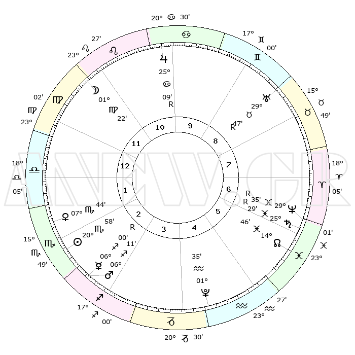 | | ΘΕΣΕΙΣ ΠΛΑΝΗΤΩΝ ΑΣΤΡΟΛΟΓΙΚΟΥ ΧΑΡΤΗ ΤΗΣ ΣΤΙΓΜΗΣ ΑΥΤΗΣ | | | | Πλανήτης | Ζώδιο | Μοίρες | Δεκαήμ. | Σε οίκο | Απόκλιση | | Ακμές των οίκων | | Ηλιος | Σκορπιός | 20°53' | Τρίτο | 2 | 17 S 58 | | 1ος | 25°11' | Παρθένος | | Σελήνη | Παρθένος | 00°22' | Πρώτο | 12 | 12 N 38 | | 2ος | 21°24' | Ζυγός | | Ερμής | Τοξότης | 06°03'R | Πρώτο | 3 | 23 S 01 | | 3ος | 21°38' | Σκορπιός | | Αφροδίτη | Σκορπιός | 07°38' | Πρώτο | 2 | 12 S 52 | | 4ος | 24°35' | Τοξότης | | Αρης | Τοξότης | 06°07' | Πρώτο | 3 | 21 S 49 | | 5ος | 27°38' | Αιγόκερως | | Δίας | Καρκίνος | 25°09'R | Τρίτο | 10 | 21 N 13 | | 6ος | 28°15' | Υδροχόος | | Κρόνος | Ιχθείς | 25°29'R | Τρίτο | 7 | 04 S 02 | | 7ος | 25°11' | Ιχθείς | | Ουρανός | Ταύρος | 29°48'R | Τρίτο | 9 | 19 N 54 | | 8ος | 21°24' | Κριός | | Ποσειδώνας | Ιχθείς | 29°35'R | Τρίτο | 7 | 01 S 25 | | 9ος | 21°38' | Ταύρος | | Πλούτωνας | Υδροχόος | 01°35' | Πρώτο | 5 | 23 S 29 | | 10ος | 24°35' | Δίδυμοι | | Β. Δεσμός | Ιχθείς | 14°46' | Δεύτερο | 6 | 06 S 00 | | 11ος | 27°38' | Καρκίνος | | Ωροσκόπος | Παρθένος | 25°11' | Τρίτο | | | 12ος | 28°15' | Λέων | | Μεσουράνημα | Δίδυμοι | 24°35' | Τρίτο | | | |