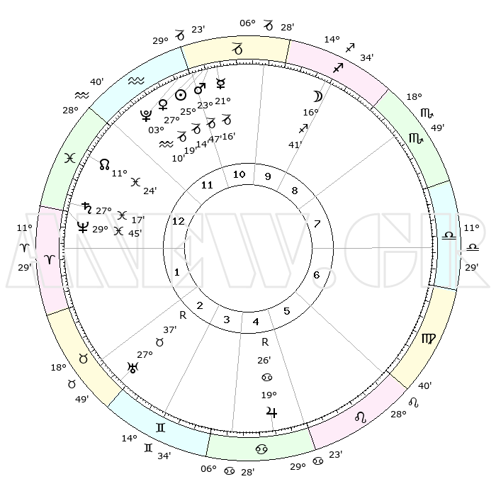 | | ΘΕΣΕΙΣ ΠΛΑΝΗΤΩΝ ΑΣΤΡΟΛΟΓΙΚΟΥ ΧΑΡΤΗ ΤΗΣ ΣΤΙΓΜΗΣ ΑΥΤΗΣ | | | | Πλανήτης | Ζώδιο | Μοίρες | Δεκαήμ. | Σε οίκο | Απόκλιση | | Ακμές των οίκων | | Ηλιος | Αιγόκερως | 25°10' | Τρίτο | 11 | 21 S 06 | | 1ος | 02°07' | Ιχθείς | | Σελήνη | Τοξότης | 15°52' | Δεύτερο | 10 | 27 S 45 | | 2ος | 17°21' | Κριός | | Ερμής | Αιγόκερως | 21°09' | Τρίτο | 11 | 23 S 33 | | 3ος | 19°39' | Ταύρος | | Αφροδίτη | Αιγόκερως | 27°14' | Τρίτο | 11 | 21 S 41 | | 4ος | 13°51' | Δίδυμοι | | Αρης | Αιγόκερως | 23°44' | Τρίτο | 11 | 22 S 18 | | 5ος | 05°32' | Καρκίνος | | Δίας | Καρκίνος | 19°26'R | Δεύτερο | 5 | 22 N 18 | | 6ος | 29°19' | Καρκίνος | | Κρόνος | Ιχθείς | 27°16' | Τρίτο | 1 | 03 S 07 | | 7ος | 02°07' | Παρθένος | | Ουρανός | Ταύρος | 27°38'R | Τρίτο | 3 | 19 N 26 | | 8ος | 17°21' | Ζυγός | | Ποσειδώνας | Ιχθείς | 29°45' | Τρίτο | 1 | 01 S 19 | | 9ος | 19°39' | Σκορπιός | | Πλούτωνας | Υδροχόος | 03°10' | Πρώτο | 12 | 23 S 08 | | 10ος | 13°51' | Τοξότης | | Β. Δεσμός | Ιχθείς | 11°25' | Δεύτερο | 1 | 07 S 17 | | 11ος | 05°32' | Αιγόκερως | | Ωροσκόπος | Ιχθείς | 02°07' | Πρώτο | | | 12ος | 29°19' | Αιγόκερως | | Μεσουράνημα | Τοξότης | 13°51' | Δεύτερο | | | |