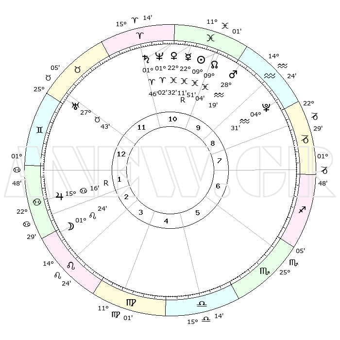 | | ΘΕΣΕΙΣ ΠΛΑΝΗΤΩΝ ΑΣΤΡΟΛΟΓΙΚΟΥ ΧΑΡΤΗ ΤΗΣ ΣΤΙΓΜΗΣ ΑΥΤΗΣ | | | | Πλανήτης | Ζώδιο | Μοίρες | Δεκαήμ. | Σε οίκο | Απόκλιση | | Ακμές των οίκων | | Ηλιος | Ιχθείς | 09°48' | Πρώτο | 10 | 07 S 53 | | 1ος | 14°37' | Δίδυμοι | | Σελήνη | Λέων | 00°43' | Πρώτο | 3 | 23 N 11 | | 2ος | 06°56' | Καρκίνος | | Ερμής | Ιχθείς | 22°12'R | Τρίτο | 10 | 00 S 09 | | 3ος | 28°10' | Καρκίνος | | Αφροδίτη | Ιχθείς | 22°28' | Τρίτο | 10 | 04 S 15 | | 4ος | 22°19' | Λέων | | Αρης | Υδροχόος | 28°17' | Τρίτο | 10 | 13 S 06 | | 5ος | 23°29' | Παρθένος | | Δίας | Καρκίνος | 15°16'R | Δεύτερο | 2 | 22 N 54 | | 6ος | 03°34' | Σκορπιός | | Κρόνος | Κριός | 01°46' | Πρώτο | 11 | 01 S 15 | | 7ος | 14°37' | Τοξότης | | Ουρανός | Ταύρος | 27°43' | Τρίτο | 12 | 19 N 28 | | 8ος | 06°56' | Αιγόκερως | | Ποσειδώνας | Κριός | 01°02' | Πρώτο | 11 | 00 S 47 | | 9ος | 28°10' | Αιγόκερως | | Πλούτωνας | Υδροχόος | 04°31' | Πρώτο | 9 | 22 S 53 | | 10ος | 22°19' | Υδροχόος | | Β. Δεσμός | Ιχθείς | 09°05' | Πρώτο | 10 | 08 S 10 | | 11ος | 23°29' | Ιχθείς | | Ωροσκόπος | Δίδυμοι | 14°37' | Δεύτερο | | | 12ος | 03°35' | Ταύρος | | Μεσουράνημα | Υδροχόος | 22°19' | Τρίτο | | | |