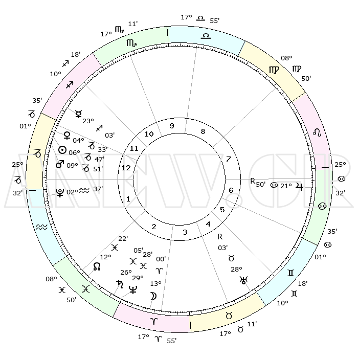 | | ΘΕΣΕΙΣ ΠΛΑΝΗΤΩΝ ΑΣΤΡΟΛΟΓΙΚΟΥ ΧΑΡΤΗ ΤΗΣ ΣΤΙΓΜΗΣ ΑΥΤΗΣ | | | | Πλανήτης | Ζώδιο | Μοίρες | Δεκαήμ. | Σε οίκο | Απόκλιση | | Ακμές των οίκων | | Ηλιος | Αιγόκερως | 06°42' | Πρώτο | 1 | 23 S 16 | | 1ος | 26°57' | Τοξότης | | Σελήνη | Κριός | 11°55' | Δεύτερο | 3 | 07 N 06 | | 2ος | 03°21' | Υδροχόος | | Ερμής | Τοξότης | 22°55' | Τρίτο | 12 | 23 S 23 | | 3ος | 13°06' | Ιχθείς | | Αφροδίτη | Αιγόκερως | 04°27' | Πρώτο | 1 | 23 S 43 | | 4ος | 17°30' | Κριός | | Αρης | Αιγόκερως | 09°48' | Πρώτο | 1 | 23 S 56 | | 5ος | 14°19' | Ταύρος | | Δίας | Καρκίνος | 21°50'R | Τρίτο | 7 | 21 N 53 | | 6ος | 06°20' | Δίδυμοι | | Κρόνος | Ιχθείς | 26°05' | Τρίτο | 3 | 03 S 39 | | 7ος | 26°57' | Δίδυμοι | | Ουρανός | Ταύρος | 28°03'R | Τρίτο | 5 | 19 N 32 | | 8ος | 03°21' | Λέων | | Ποσειδώνας | Ιχθείς | 29°28' | Τρίτο | 3 | 01 S 26 | | 9ος | 13°06' | Παρθένος | | Πλούτωνας | Υδροχόος | 02°37' | Πρώτο | 1 | 23 S 15 | | 10ος | 17°30' | Ζυγός | | Β. Δεσμός | Ιχθείς | 12°22' | Δεύτερο | 2 | 06 S 55 | | 11ος | 14°19' | Σκορπιός | | Ωροσκόπος | Τοξότης | 26°57' | Τρίτο | | | 12ος | 06°19' | Τοξότης | | Μεσουράνημα | Ζυγός | 17°30' | Δεύτερο | | | |